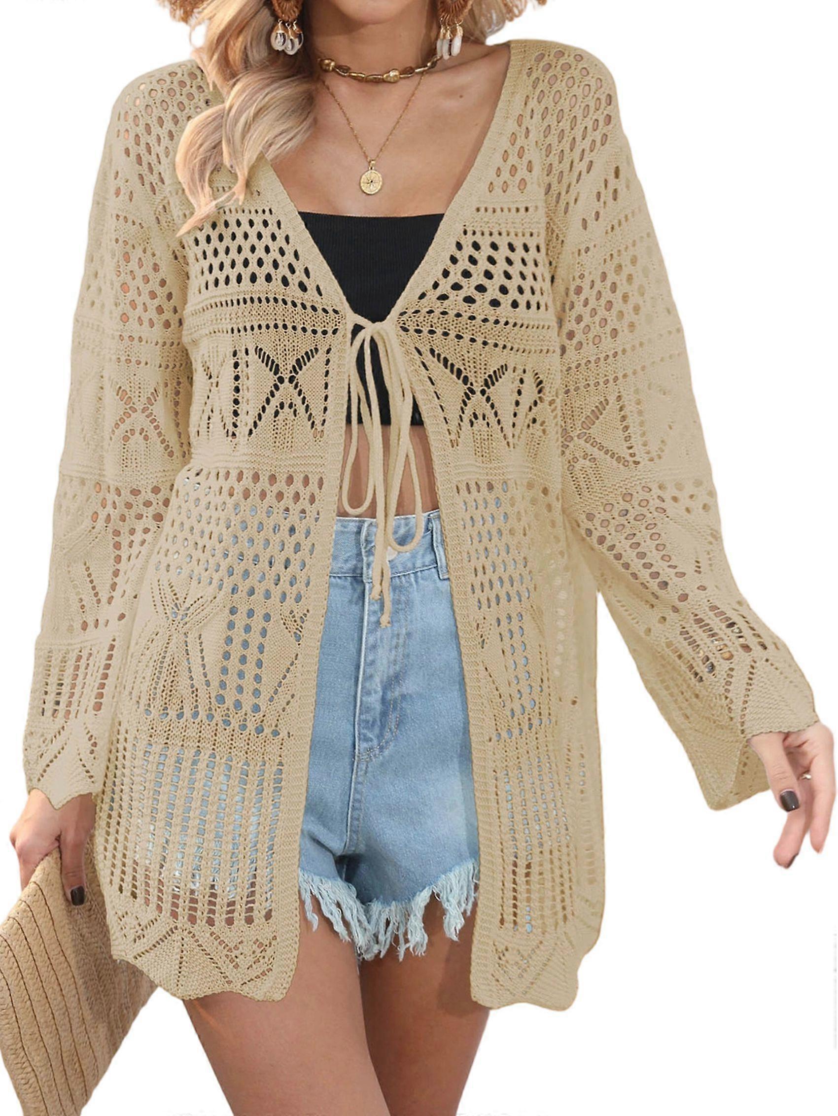 Women'S Beach Vacation Cover Up Bikini Tie Front Long Sleeve Sun Protection Cardigan Khaki One size