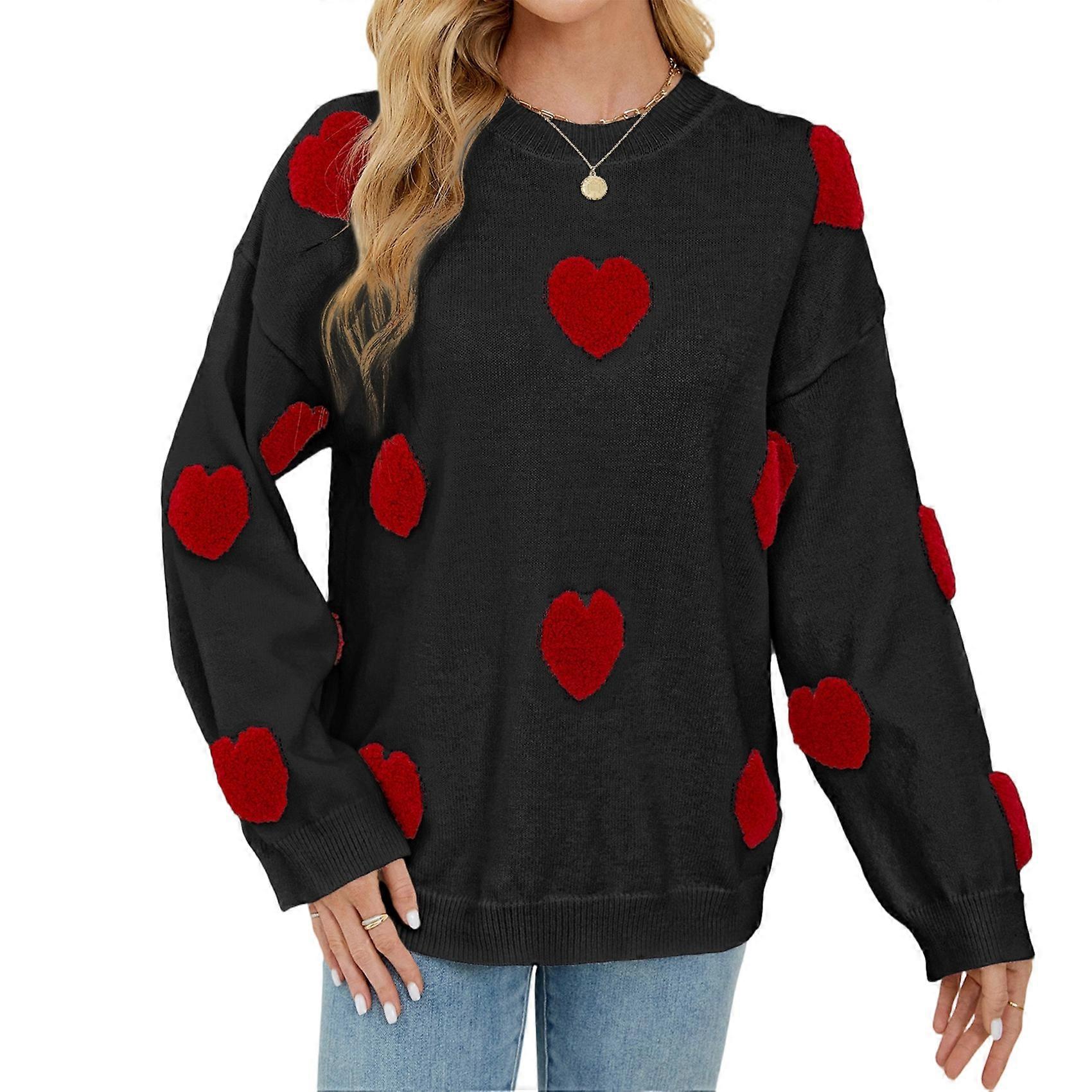 Womens 3D Irregular Heart Print Round Neck Lazy Style Pullover Knit Sweater Casual Top Black XL