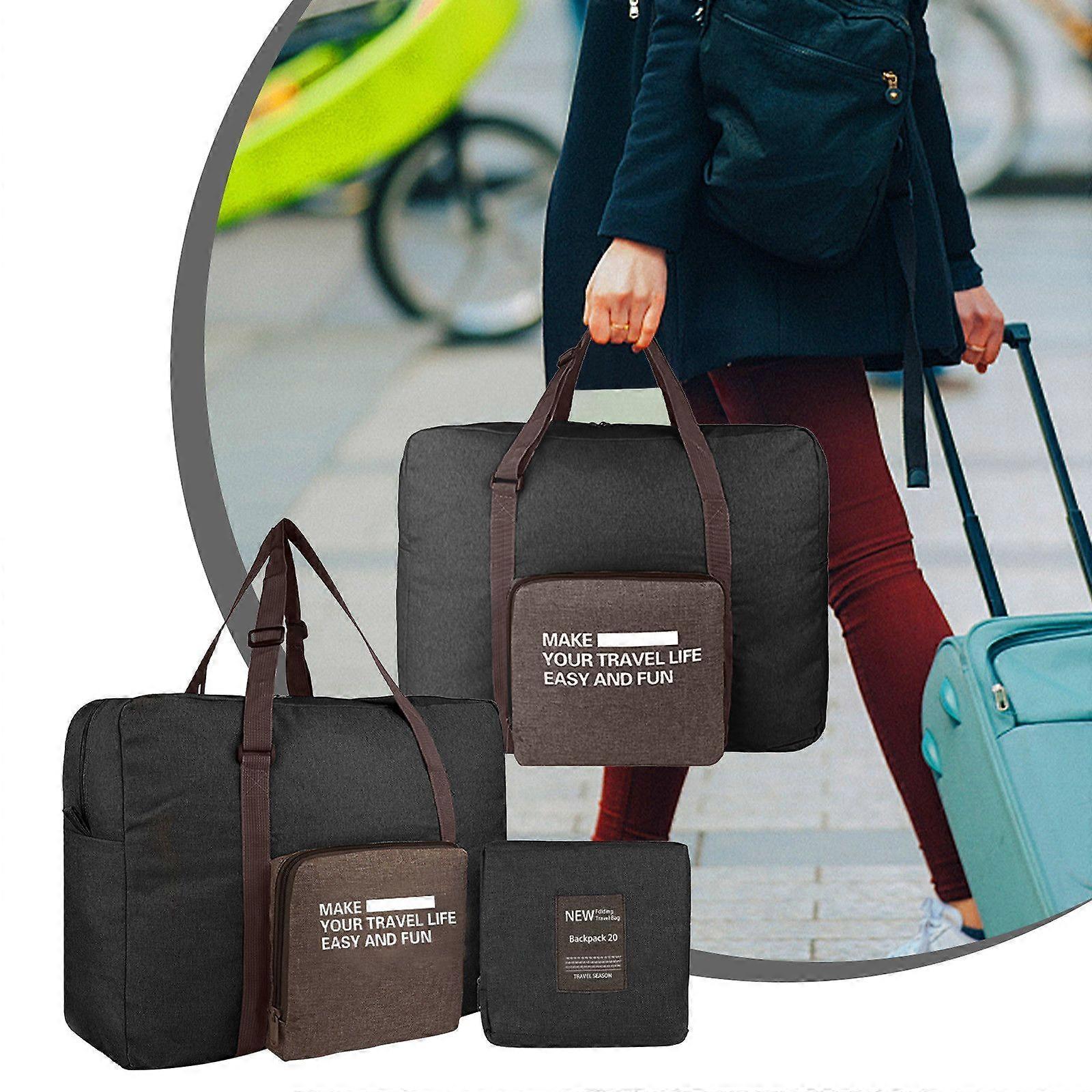 Womens Travel Bags, Carry On For Women, Sports Gym Bag, Workout Duffel Bag, Overnight Shoulder Bag Feature: Material: Oxford cloth Color:Black Product size: 45x35x19cm/17.7x13.77x7.48in(before folding) Packing size: 40x25x3cm /15.75x9.84x1.18in Net weight: 350g/0.77lb Gross weight: 350g/0.77lb Applicable scene: Home, Outdoor Description: 【Perfect Dimensions and Airplane Friendly】: Big size (H*W*T)45x35x19cm/17.7x13.77x7.48in, 0.35kg/0.77LB weight. (For reference, please refer to the actual measurement). The perfect compliant bag for airline travel. Integrated trolley sleeve slides over rolling luggage handle making airport travel easy. Your ideal overnight weekend boarding bag for business or travel. 【Multi-purpose Design】: The overnight bag comes with a large shoulder strap can relaxing your hands if you prefer to carry it over the shoulder that made toting it around so much easier as a shoulder bag. Large capacity travel bag , Multiple internal and external organizational pockets ensure you have a place for everything, fit 17.7 inch laptop computer. 【Well-Designed】: Unique Durable Oxford cloth lightweight and tear 0.77lb. This duffel bag is easy to fold back.When the bag is no longer needed just fold it right back up into the, zip it up and store it on a shelf or under a cupboard.It is so small it could be stored anywhere. 【Expansion of capacity】: Side expansion zipper layer, easily increase the bag capacity. EASY TRANSPORT: A strap allows bag to slide over the luggage handle tube for Easy Transport without Packable. Fast packed into itself and easy to carry. Package Content: 1 xTravel Duffle Bag 1x makeup bag .