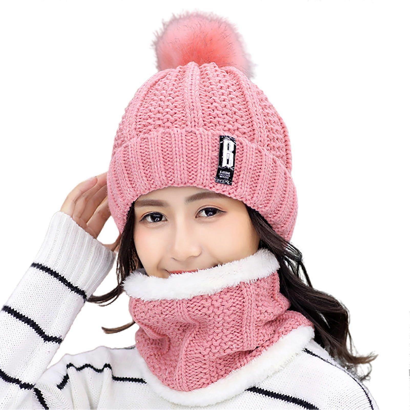 Winter Women Thick Knitted Beanie Hat Plush Neck Gaiter Scarf Outdoor Riding