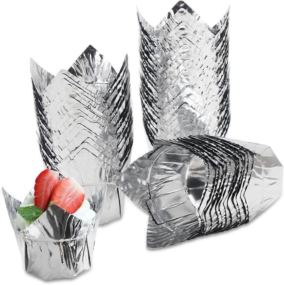 TULIP MUFFIN CUPS-- Made of food grade foil paper which is greaseproof. It can withstand 425 degrees safe no odor no fading no sticking wrapping paper is easy to remove when eating muffins. ALUMINUM FOIL CUPCAKE LINERS-- 2 different colors golden and silver 50 pieces of each color enough baking cups and different colors meet your different needs. DECORATION CUPS FOR WEDDINGS-- Dual-use Function: Aluminum foil paper baking cups are both cake baking molds and baking traying as it can be place in the oven and bake directly. CUPCAKE-- Professional looking baking cup paper: a professional look to your homemade muffins brioche cupcakes egg bake cups and more. ANNIVERSARY BAKING CUPS-- Size:3.14x1.96x1.96 inch.Package includes: 100 pieces of baking cups.