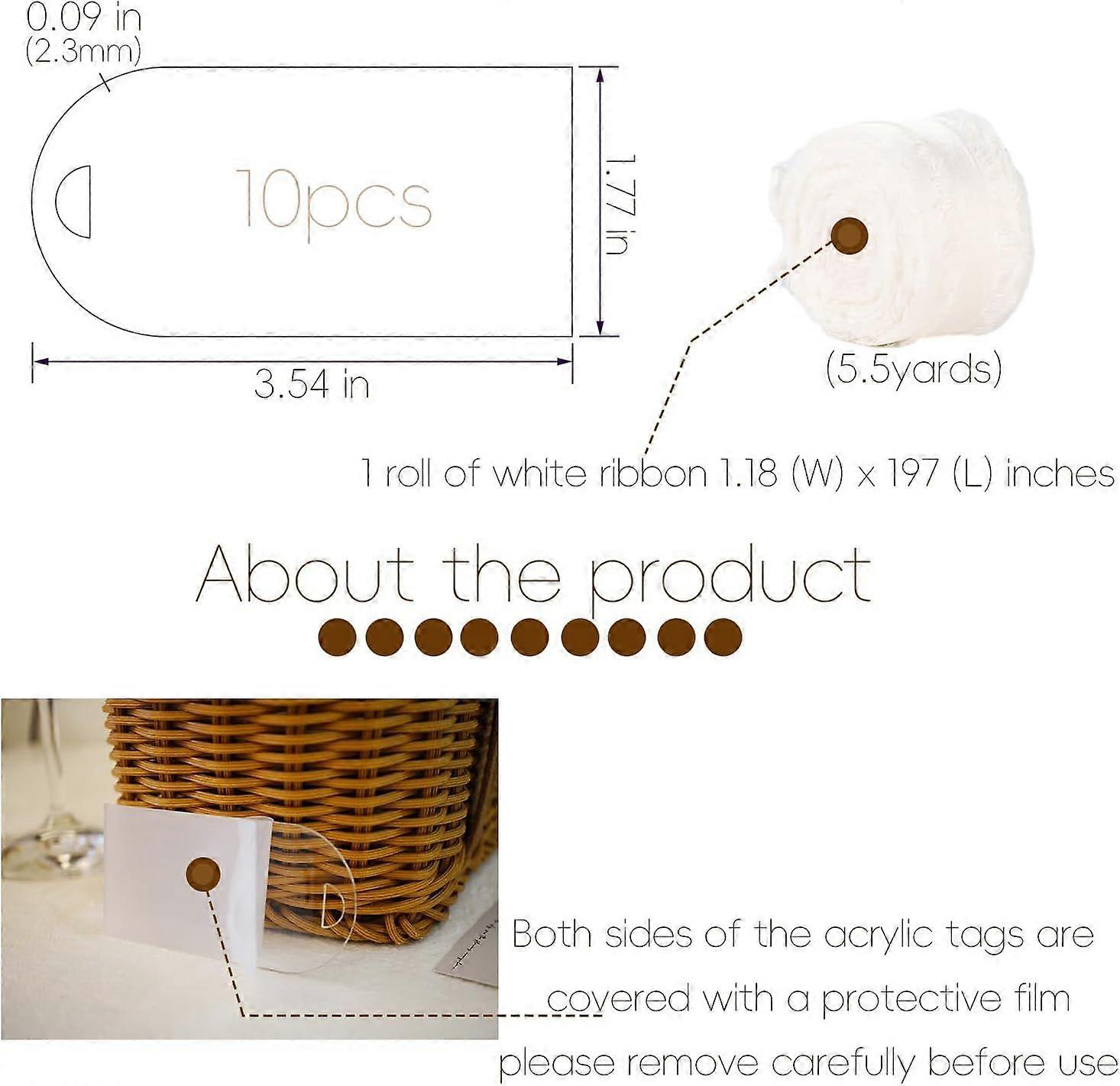 What You Get: 10 acrylic tags 1.77 (W) x 3.54 (L) inches ,1 roll of white ribbon 1.18 (W) x 197 (L) inches(5.5yards) How To Use: Made of clear acrylic,thicker and more transparent to ensure sturdiness and durability.You can use a marker to write on it or use paint to create more creative designs Wide Application: Suitable for weddings, engagement party, birthday party, bridal showers, anniversary party, family reunions and various festivals. In addition, these labels can also be used to sort and organise storage, kitchen and toys, bringing more convenience to your life. They are also used for crafts Important Information:Both sides of the acrylic name tags are covered with a protective film, please remove carefully before use. The machine cutting process may leave scratches on the protective film, after removing the film you will see a transparent product.Due to differences in production batches, the protective film may differ a bit, but this does not affect the quality or functionality of the product.If you have any questions, please do not hesitate to Arched Design: perforated acrylic name plate have an arched design that is visually appealing and makes them stand out in any situation