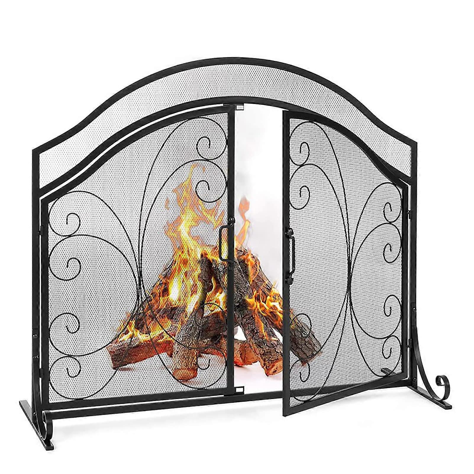 Wrought Iron Fireplace Screen with Doors, Spark Protection Mesh, Decorative Tree Design for Indoor Outdoor Use