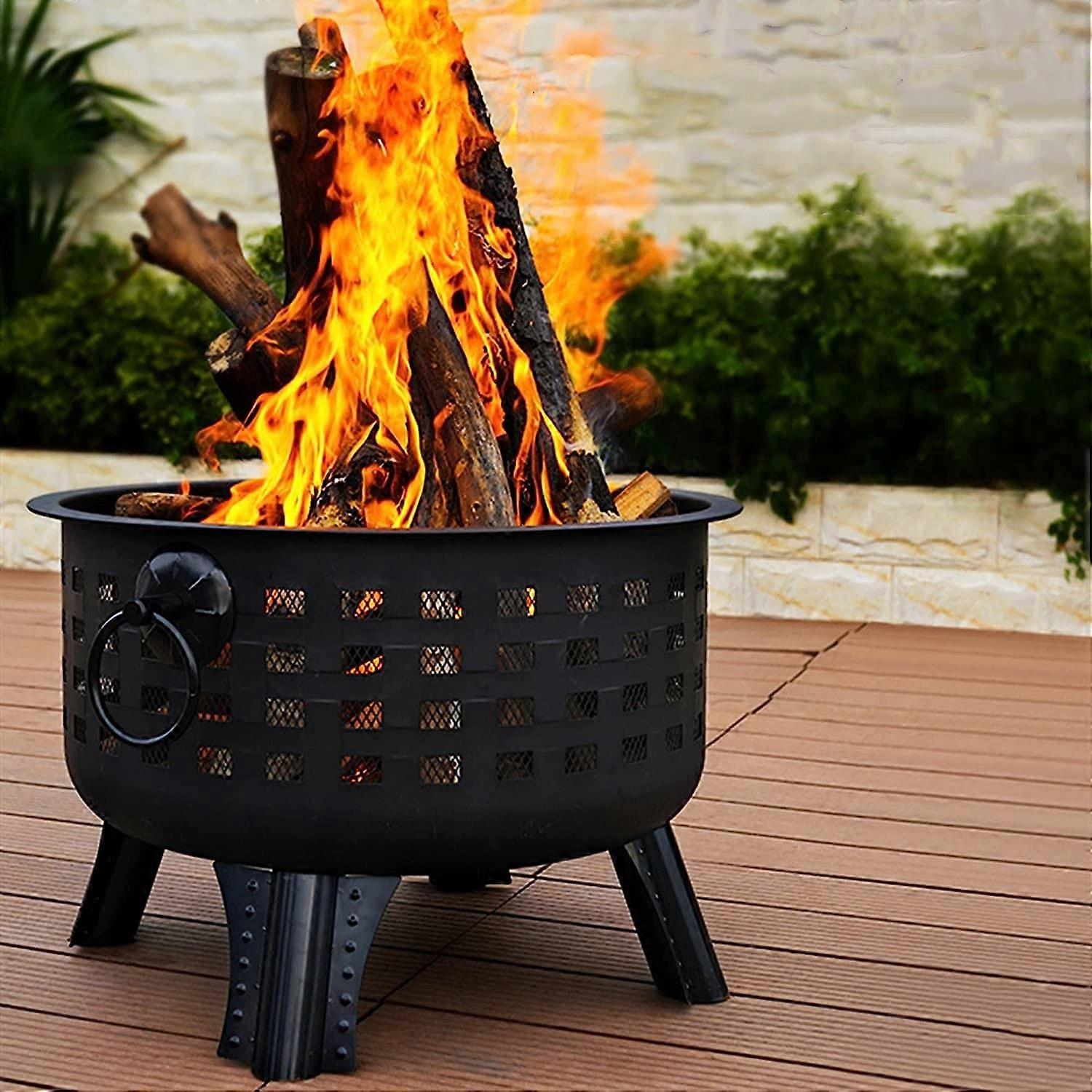 Large Outdoor Steel Wood Burning Fire Pit Bowl with Cooking Grate, Spark Screen and Poker