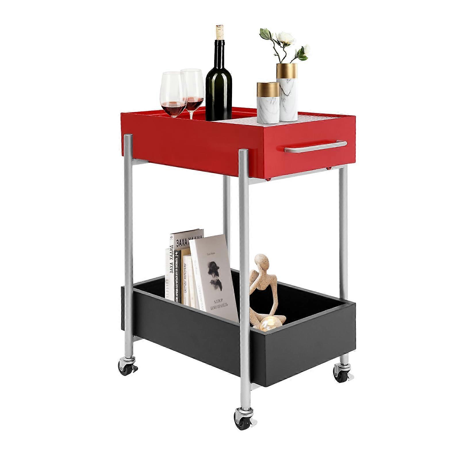 Product overview A two tier organizer designed to keep everyday items neat and accessible. Strong construction and smooth mobility make it practical for multiple rooms while the red and black finish adds a modern, refined look. Key benefits Clear organization: Two tiers separate and store books, snacks, and other daily necessities so surfaces stay tidy and items are easy to find. Reliable load capacity: Made from strength material with stable construction to support approximately 66 lbs, letting you place heavier items with confidence. Easy to move and secure: Four universal wheels allow smooth rolling between rooms; wheel brakes lock the unit in place for stable stationary use. A side handle provides a convenient grip for repositioning. Modern appearance: Simple red and black color matching creates a contemporary, upscale accent that fits living rooms, kitchens, home offices, and bedrooms. Features and performance Function: Two open tiers for visible, quick access storage. Material: strength construction for durability and stable support. Mobility: Four caster wheels for effortless movement; brakes on wheels for added stability when parked. Usability: Side handle for easy handling and roomtoroom transfer. Loadbearing: Supports approximately 66 lbs in total. Practical use scenarios Home office: Store reference books, notebooks, a small printer, or office supplies on the two tiers for organized access. Kitchen or pantry: Keep snacks, canned goods, or frequently used utensils within reach while rolling the unit to the prep area and locking it when needed. Living room or bedroom: Use for magazines, remote controls, chargers, and bedside essentials to reduce clutter and keep items organized. Why choose this organizer This two tier organizer combines practical storage, dependable load support, and mobile convenience with a modern color scheme. Its compact, durable design helps create a cleaner, more organized home environment while remaining easy to move and secure wherever you need it.