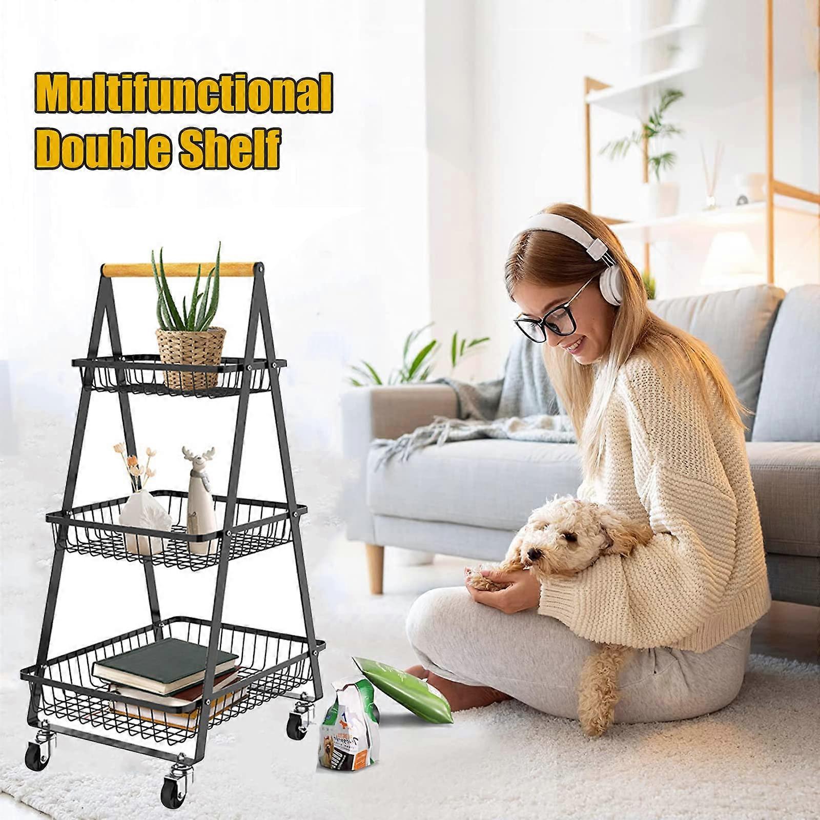 Rolling Utility Cart with Lockable Swivel Wheels, 3 Tier Mesh Storage Shelves, Metal Organizer for Kitchen Office Bedroom (Black)