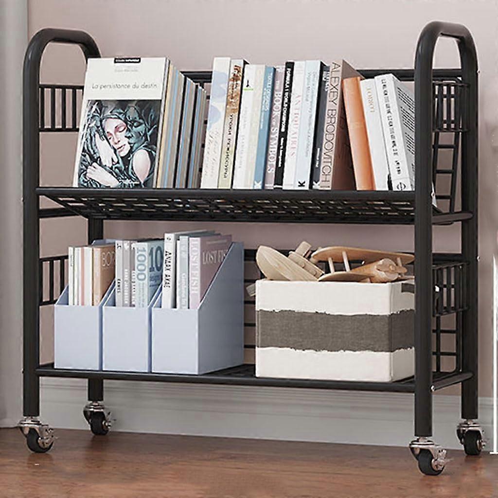 Product overview A compact, two layer mobile bookshelf designed for reliable everyday use. Finished in black with a durable plastic sprayed iron rod frame for longlasting wear resistance and stable support. Key benefits Durable construction for confidence in daily use: iron rod frame with a protective plastic spray finish resists wear and keeps the cart looking good over time. Smooth mobility and secure placement: four 360 degree rotating wheels make it easy to move between rooms. Lock two wheels to keep the cart firmly in place when you need stability. Prevents items from falling: integrated handrail with a smooth arc corner and an 85 degree tilt angle holds books and magazines securely against the shelf while allowing easy access. Flexible storage and organization: adjustable side gear lever lets you change shelf spacing and tilt angle to suit different items, from tall files to stacked books and periodicals. Why this product solves common problems Eliminates heavy lifting and repeated trips by letting you move collections of books, files, or supplies at once. Reduces clutter by providing a dedicated, adjustable storage surface that adapts to the items you store. Improves safety and usability with a handrail that prevents slips and reduces edge wear on stored items. Practical applications Classroom or library use for transporting and displaying reading materials during lessons. Office filing and document transport for meetings, mailroom tasks, or shared workspaces. Home use as a compact bookshelf for living rooms, study areas, or craft supplies that need to be mobile. Specifications at a glance Layers: 2 Color: black Frame material: iron rod with plastic spray finish Mobility: 360 degree rotating wheels, two wheel locks Design features: integrated handrail with smooth arc corner and 85 degree tilt angle; adjustable side gear lever for varied spacing and angles This two layer mobile bookshelf combines sturdy materials, secure storage features, and flexible organization to support a variety of everyday storage and transport needs.