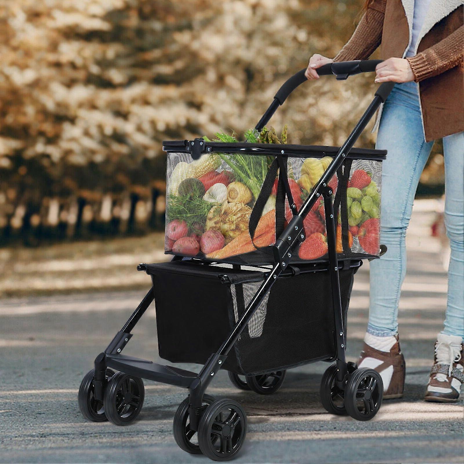 Folding Shopping Cart with 360 Swivel Wheels, Heavy Duty Collapsible Grocery Cart for Stairs and Laundry, Black