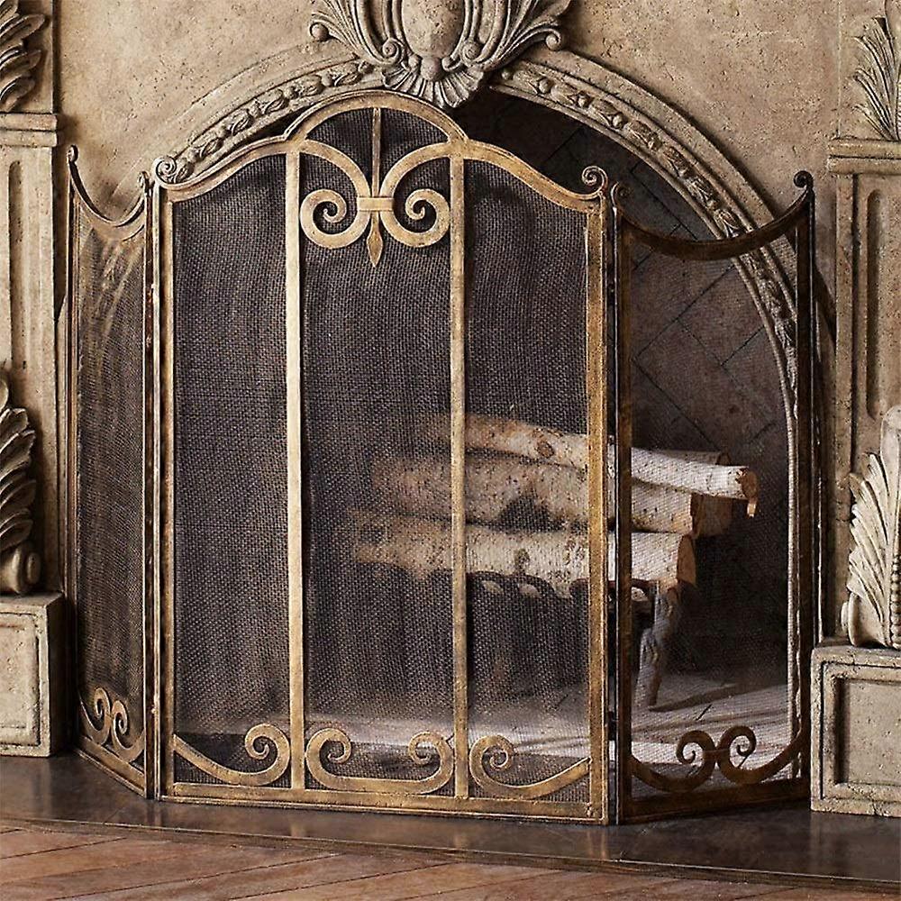 Fireplace Screen Vintage Gold Give your fireplace an elegant finish while reducing the risk of stray embers and sparks entering the room. This threepanel fireplace screen uses fine steel mesh framed in wrought iron to diffuse heat, allow warmth to pass through, and provide a decorative barrier in front of the fire. Key benefits Ember and spark control: Fine steel mesh blocks bright embers and flying sparks while still letting heat into the room. Heat diffusion: Wrought iron mesh disperses heat more evenly than glass and is resistant to cracking. Physical barrier: Sturdy construction deters direct contact with the fire by children and pets and provides a visible boundary in front of the hearth. Decorative finish: Vintage gold color with ornamental scrollwork complements many interior styles. Portable and low maintenance: Threepanel foldable design folds flat for storage and transport, finished surface wipes clean to reduce ash and stain buildup. Features Material: Wrought iron frame with steel mesh. Color: Vintage Gold. Size: Overall 114 cm x 90 cm width x height (44.9 x 35.4 inches). Weight: 10 kg 22 lbs. Design: Threepanel foldable screen with two sturdy hinges between each panel for adjustable opening angles. Coating: Nano cooking coating for a finished surface that resists staining. Assembly: No assembly required. Package contents: Firewall x 1 Cleaning and care Do not clean while the screen is hot or apply water to a hot surface. Allow the screen to cool before cleaning. Clean with mild soap and water and wipe dry with a soft cloth. Do not use bleach or harsh abrasives that could damage the wrought iron finish. Typical uses Living room fireplace: Place directly in front of the hearth to reduce ember escape and add a classic decorative element to the room. Outdoor fire pit: Use as a spark arrester for outdoor fireplaces and fire pits; fold for transport to picnics or camping. Decorative barrier: Use as a seasonal screen to enhance mantel displays or to create a visual focal point around the fireplace. What makes it stand out Combines function and style with durable wrought iron construction, fine steel mesh for effective ember control, and a vintage gold ornamental design. Foldable threepanel construction offers flexibility for different fireplace widths and convenient storage when not in use. Ready to use out of the box with no assembly required. Specifications Name: Fireplace Screen Colour: Vintage Gold Material: Metal. Wrought iron and steel mesh Weight: 10 kg 22 lbs Overall size: 114 cm x 90 cm width x height 44.9 x 35.4 inches No assembly required Packing: Firewall x 1