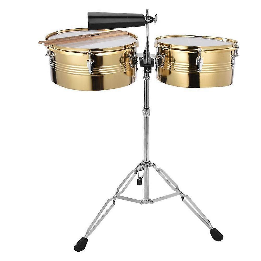 Singlemetal drum set designed for Latin percussion styles, sold as a readytoplay kit. Clean, compact construction and straightforward operation make this instrument a practical choice for live performance, rehearsals, and classroom use. Key benefits Readytoplay kit includes two drums, two sticks, four brackets, and one cowbell so setup is fast and simple. Metal construction delivers durable performance and consistent tone for regular use. Quick to learn and easy to operate, making it suitable for beginners and experienced percussionists who need a reliable rhythm source. Pairs naturally with a cowbell to expand rhythmic options and blend with and Latin music styles. Two color options let you choose a look that matches your kit or stage setup. What makes it stand out Singledrum design with a short metal cover focuses the sound for clear, percussive attack and a range of distinct tonal colors. Designed for stick play to produce defined rhythms and articulate accents. Versatile across genres where compact percussion and bell accompaniment are required. Specifications Condition: 100 percent brand Material: metal drum with short metal cover Color options: Gold, Silver Package contents: 2 drums, 2 drum sticks, 4 brackets, 1 cowbell How it solves common needs Replaces larger, more complex percussion setups when space or transport is limited. Provides a consistent rhythmic backbone that complements drum kits and other ensemble instruments. Offers a durable, lowmaintenance option for rehearsal halls, schools, and mobile performers. Practical use scenarios Live band performance: Add portable percussive accents and bell patterns on stage without a large footprint. Studio or home recording: Capture clear rhythmic textures that sit well in mixes for and Latin influenced tracks. Education and practice: Teach rhythm patterns, hand technique, and ensemble timing with a durable, easy to mount instrument. What is included Two metal drums with short covers Two drum sticks Four mounting brackets One cowbell This kit provides a straightforward, durable percussion solution for musicians seeking clear rhythmic expression and easy integration with existing setups.