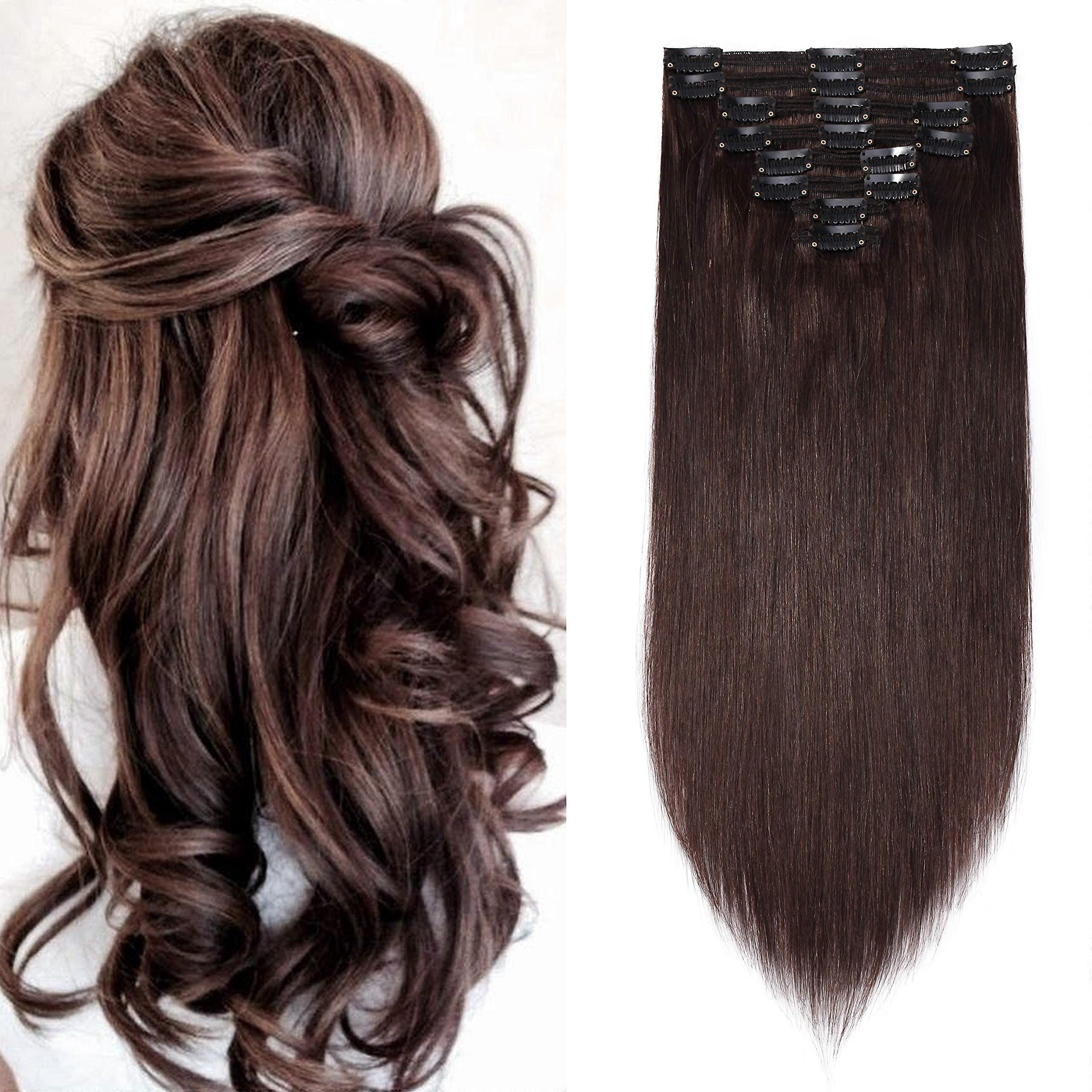 20 Inch Double Weft Clip in Human Hair Extensions Thick Full Head Straight Dark Brown 150g
