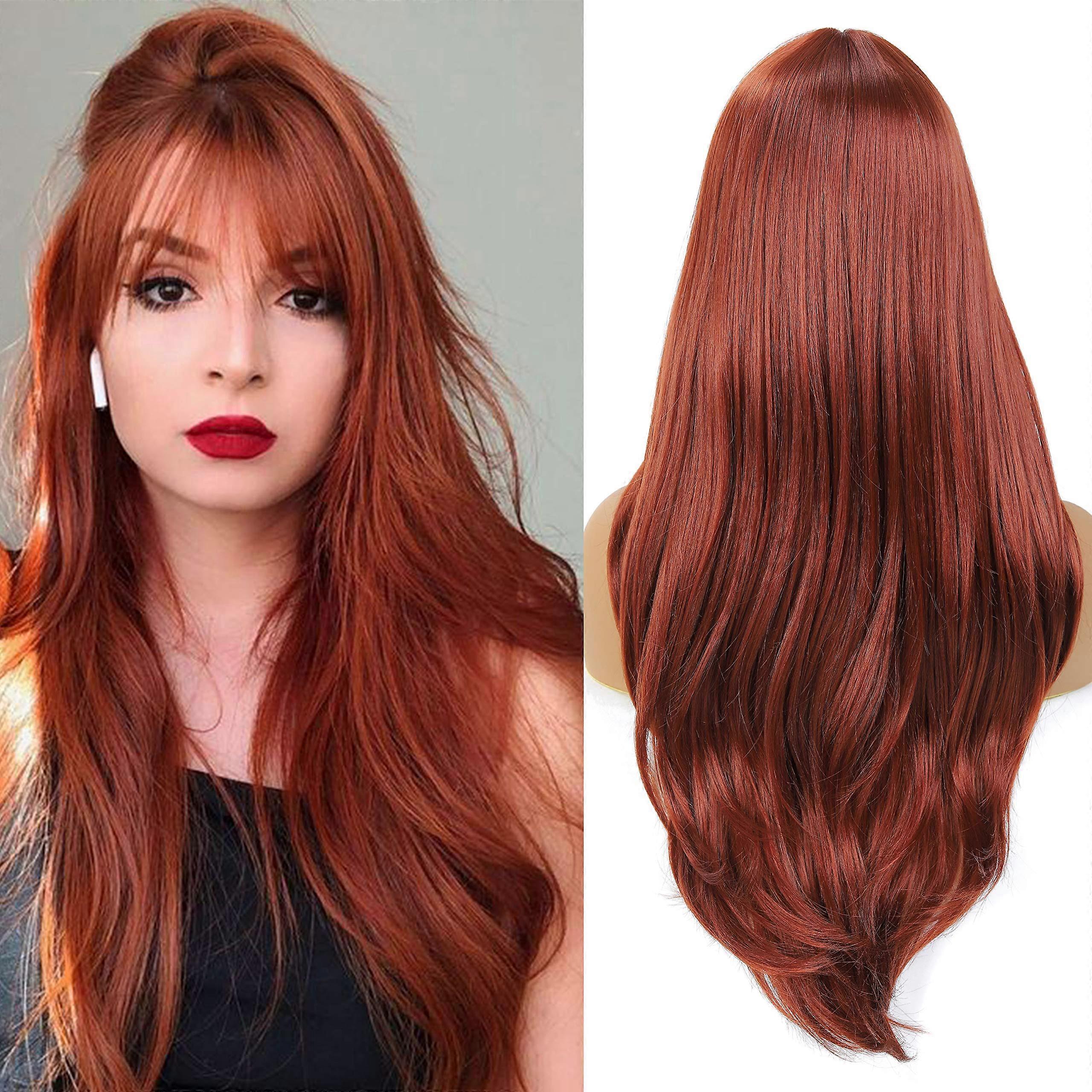 Ginger Wig Long Copper Red Wavy 24 Inch Heat Resistant Synthetic Hair with Bangs for Women Cosplay