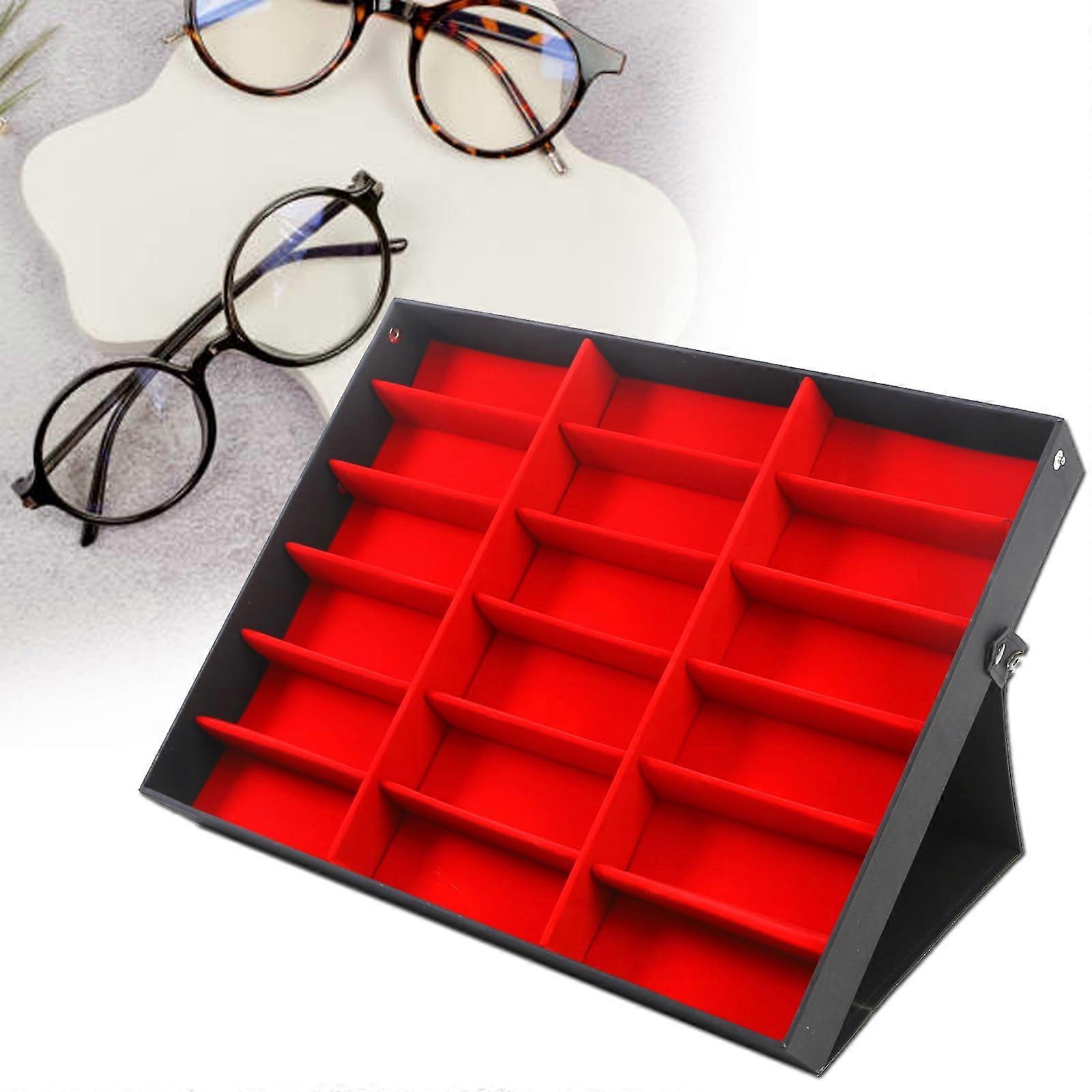 18 Grid Glasses Display Case Sunglasses Organizer with Foldable Design and Durable Fiberboard Build (Black Red)