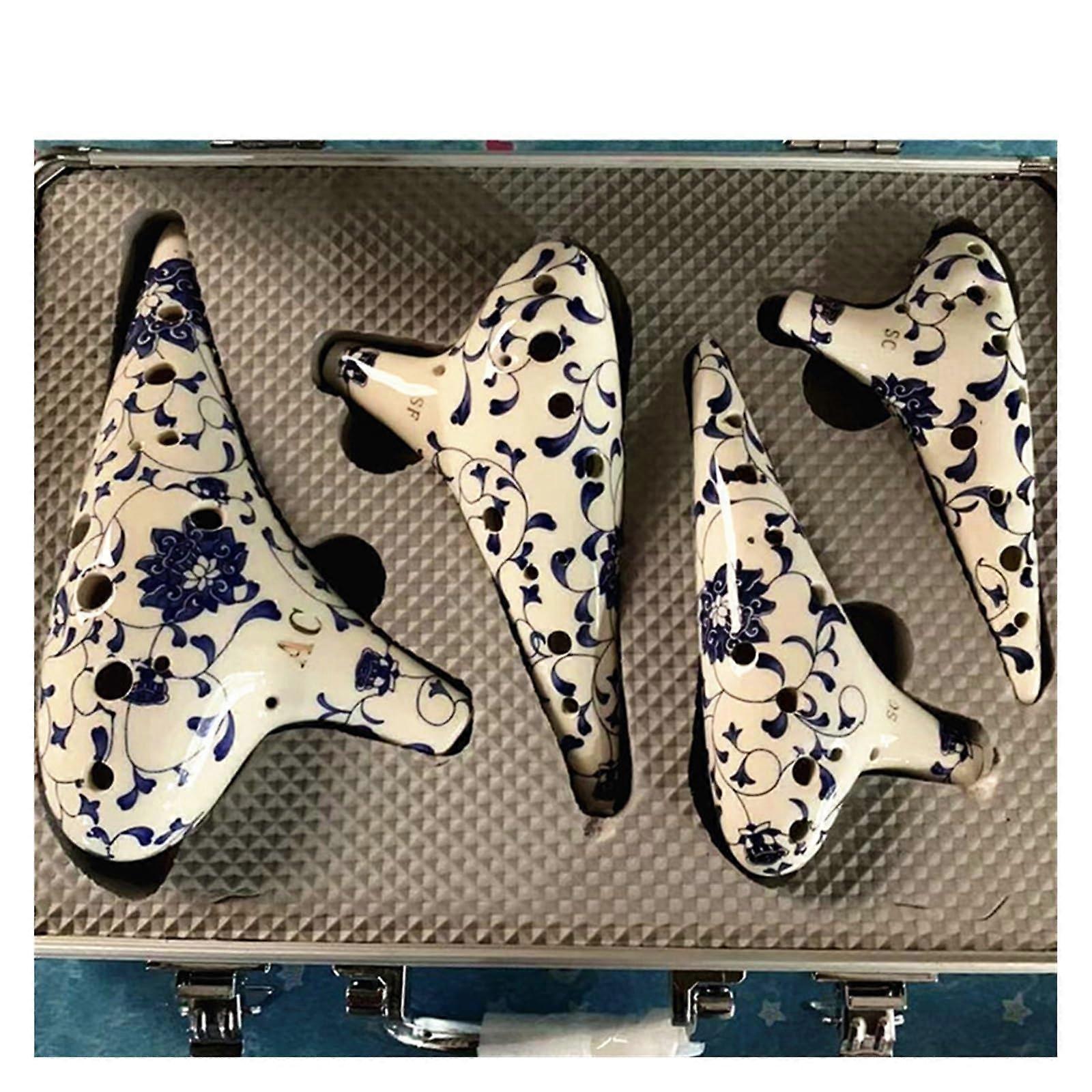 Professional 12 Hole Ocarina Set Blue and White Ceramic 4 Piece AC SF SG SC with Aluminum Case
