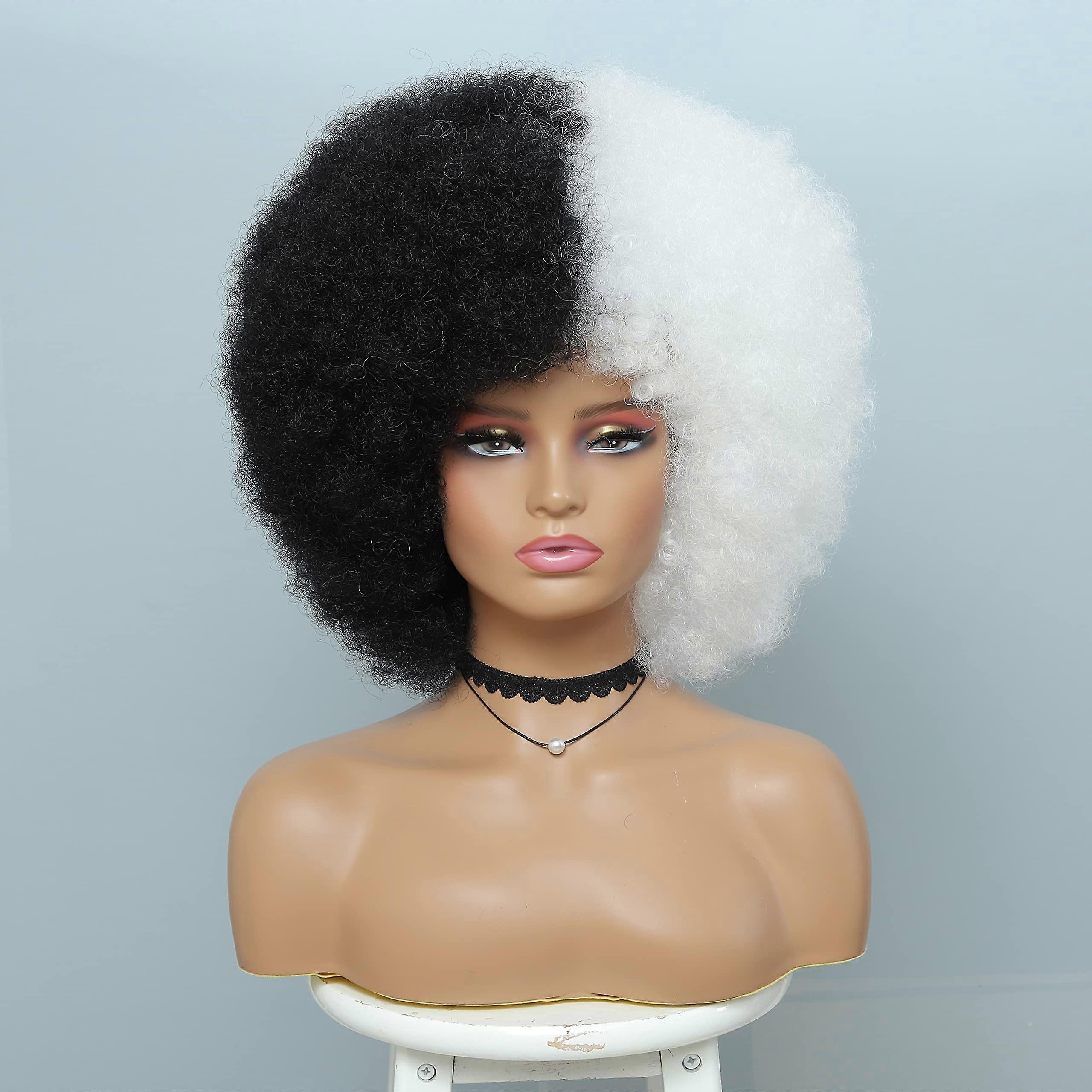 Black and White Curly Afro Wig with Bangs for Women, 70s Style Synthetic Short Wig, Natural Afro Volume