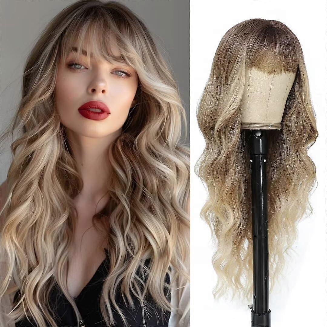 Blonde Wig With Bangs Long Wavy Heat Resistant Synthetic Glueless None Lace 26 Inch Dark Root Wig For Women