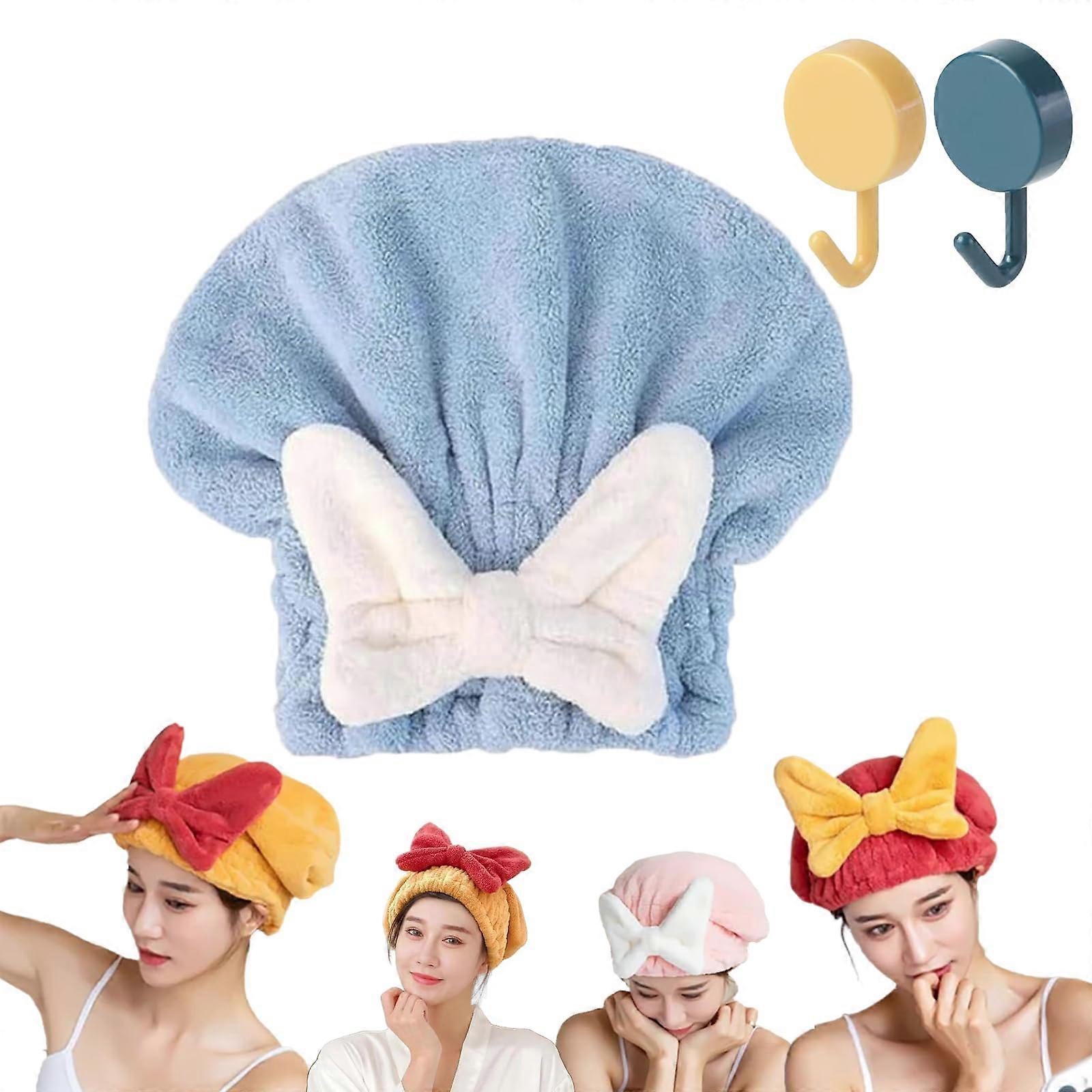 Super Absorbent Hair Towel Wrap for Wet Hair, Soft Coral Velvet Quick Dry Hair Drying Cap with Bow, Blue