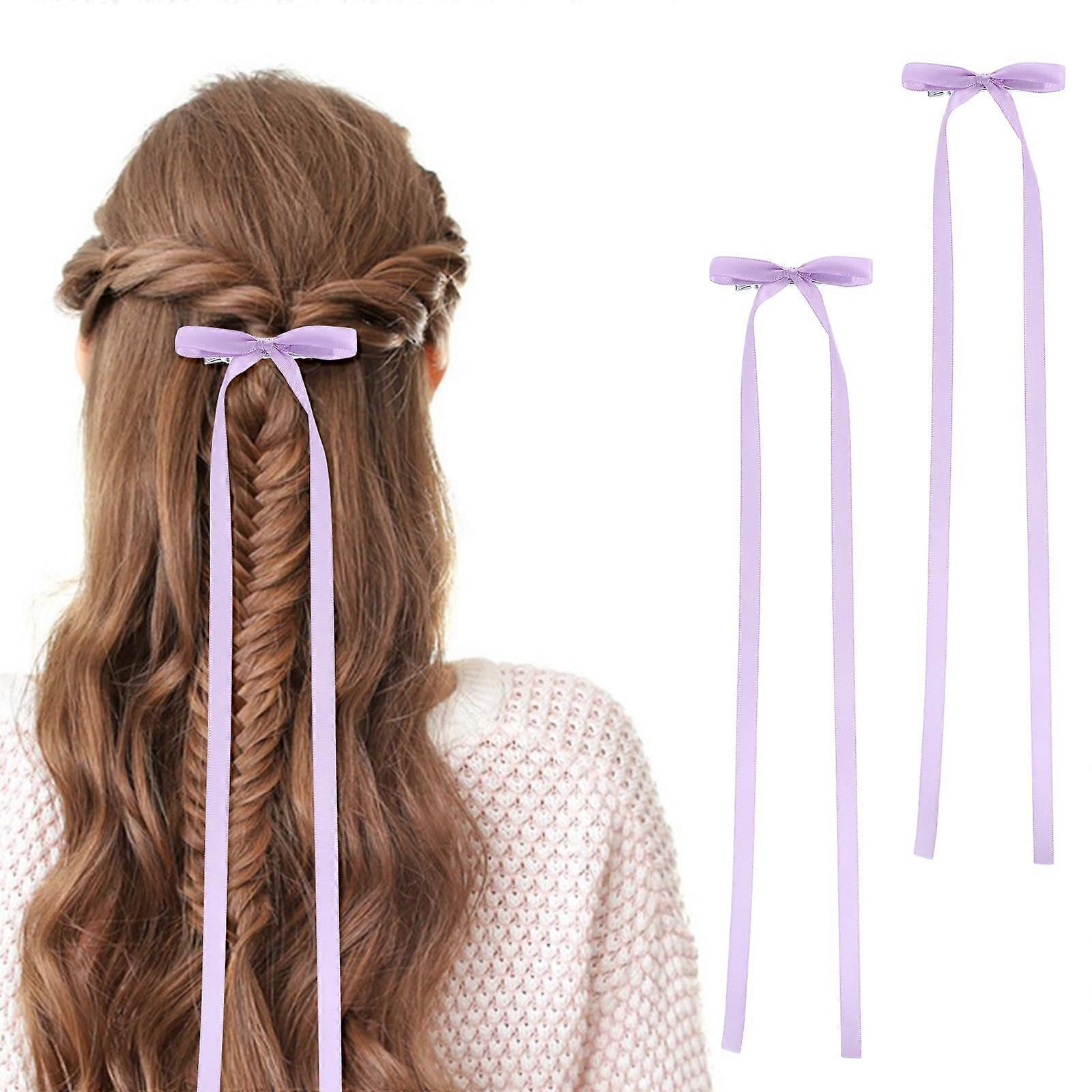 Elegant Purple Satin Hair Bows with Long Ribbon Clips for Women and Girls, 2 Piece Set