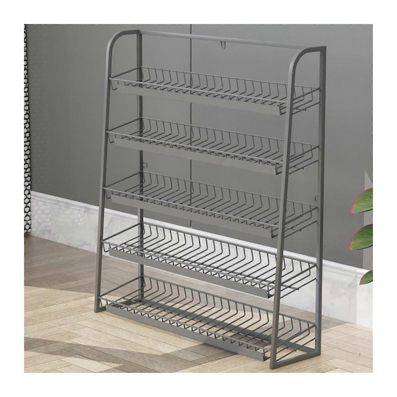 Multifunctional Snack Display Rack and Storage Shelf A sturdy, minimalist display rack designed for organized, visible storage of snacks and packaged goods. The trapezoidal frame provides strong stability while the angled tiers keep items visible and easy to reach. Constructed from iron for reliable load bearing and longterm use, the rack can be placed on countertops or mounted to a wall to save space. Key features Stable trapezoidal frame for greater stability and reduced wobble on counters and registers. Angled shelf design keeps upper items unobstructed and improves visibility of lower items. Iron construction for strong bearing capacity and resistance to bending or deformation. Hole design allows secure wall mounting with nails or screws to up counter space. Modern, minimalist look fits a variety of room and store styles. Available colors: White, Black, Grey. Available sizes (W x D x H): 17.72 x 5.91 x 26.38 in (45 x 15 x 67 cm) 19.69 x 5.91 x 26.38 in (50 x 15 x 67 cm) 23.62 x 5.91 x 26.38 in (60 x 15 x 67 cm) What it stores Ideal for snacks, potato chips, candy, packaged foods, boxes, cans, beverages, fruit and vegetables. Suitable for single items or grouped packages for easy customer selection. Practical applications Supermarket or convenience store checkout area for impulse items and small packaged goods. Kitchen or pantry countertop to organize snacks, canned drinks, or produce while keeping surfaces tidy. Drugstore or retail display for small merchandise that needs clear visibility and quick restocking. Performance and use Stable on flat surfaces including counters and cash registers without shaking. Angled tiers reduce the need to move items to see what is below, speeding selection and restocking. Wallmount option increases usable floor and counter space. Durable iron material supports everyday retail and home use. Package contents 1 x Snack Display Rack Suitable for storage, organization, and product display in retail and home settings.
