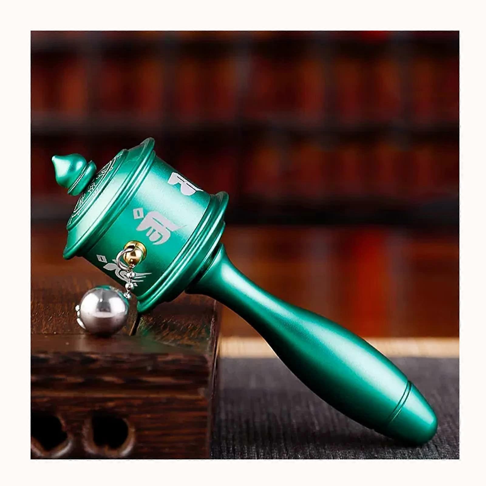 Green Tibetan Prayer Wheel Brass Drum with Ergonomic Wooden Handle, Double Bearing Rotation for Meditation