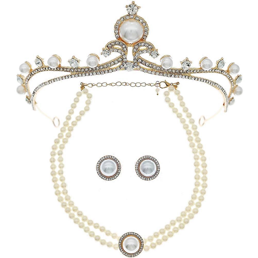 Tiara Necklace and Earring Set for Decorating Use 1Set Golden Pearl Alloy Jewelry