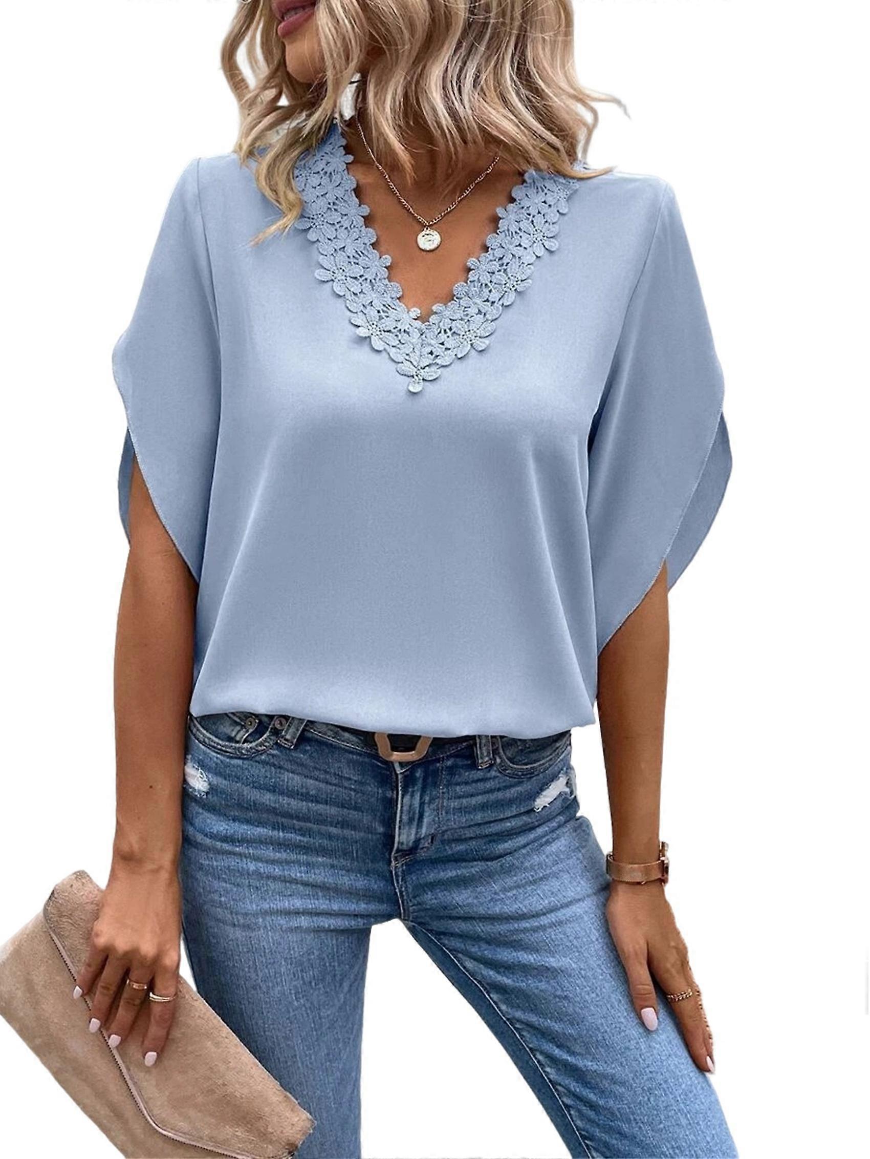Women'S Blouse V-Neck Short Sleeved Shirt Light Blue M