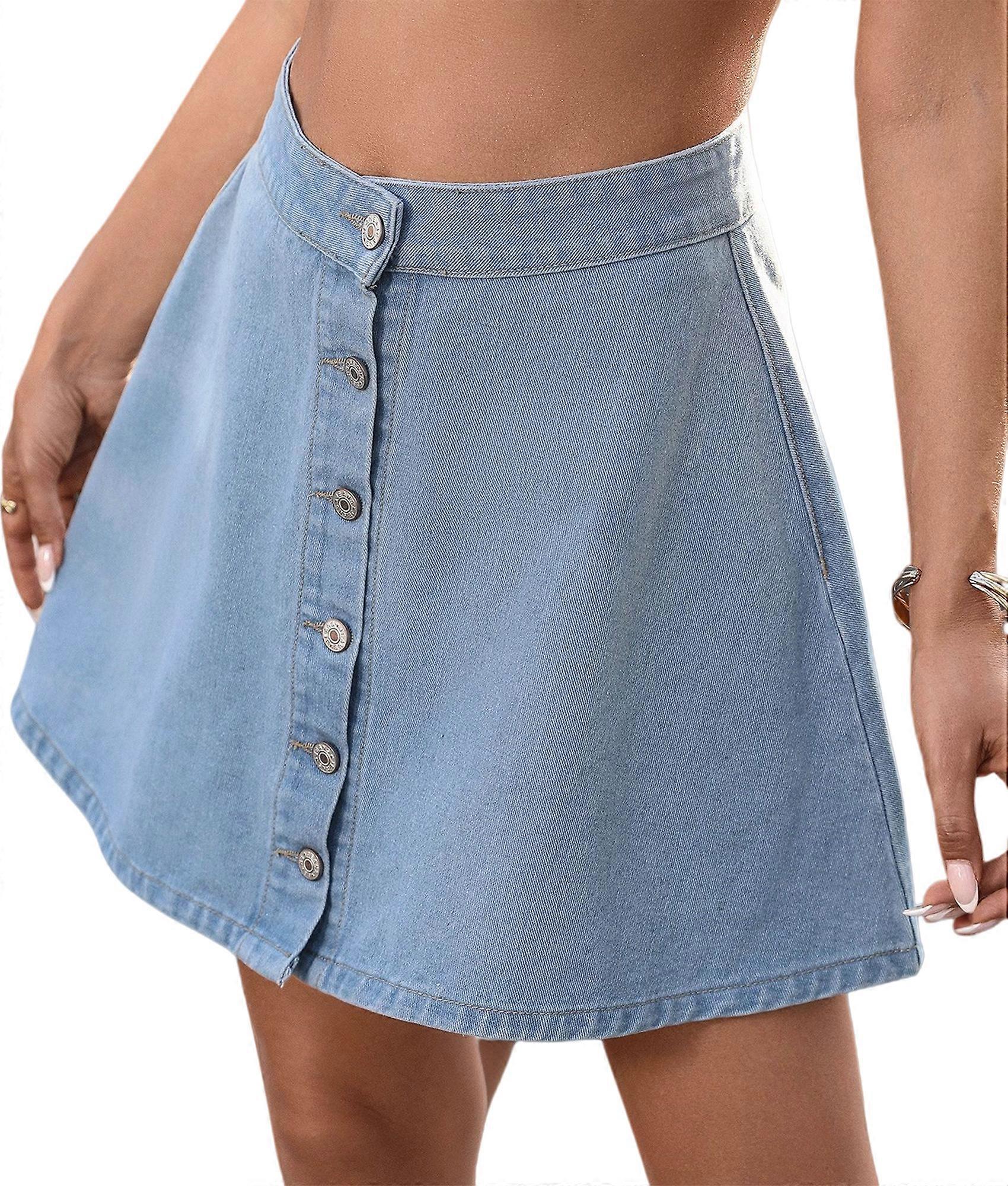 Womens Washed Denim Button Front Short Flared Skirt A Line Mini Skirt Casual High Waist Light Blue XXL