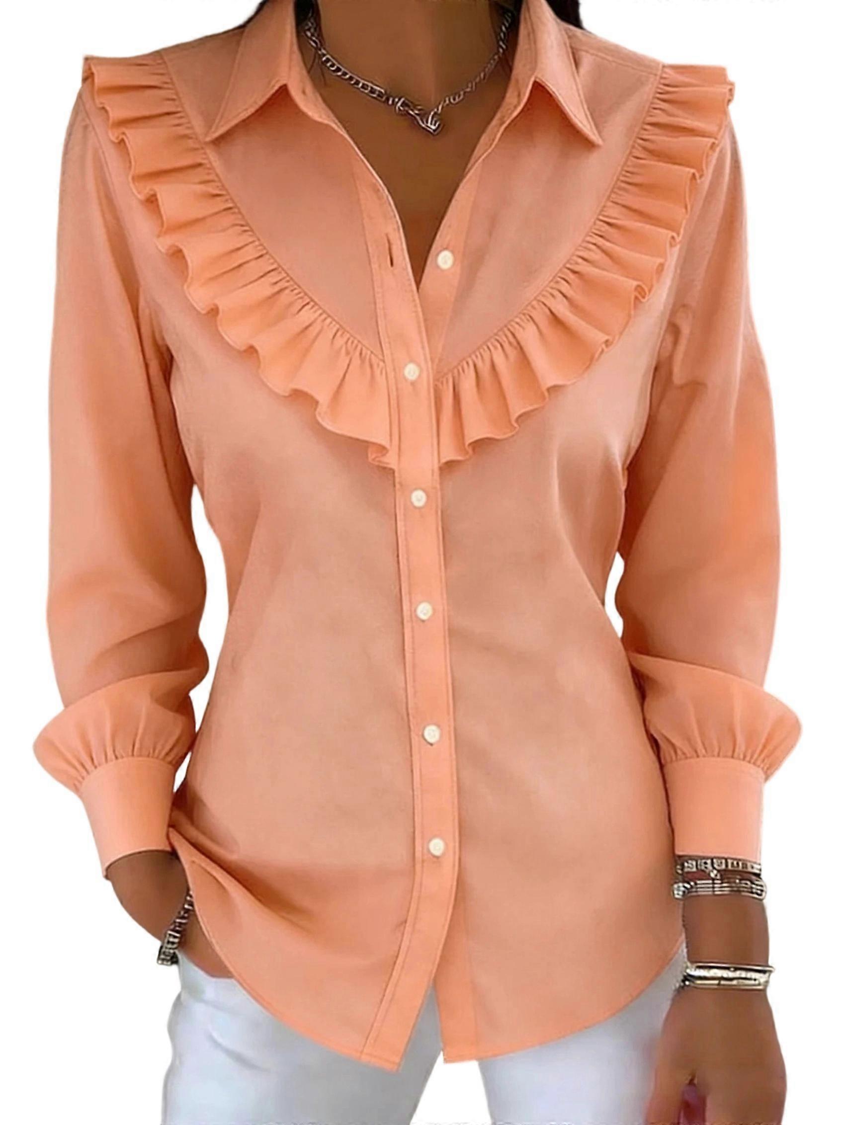 Women Long Lantern Sleeve Blouse Tops V Neck Shirts Turn Down Collar Loose Blouses Orange M