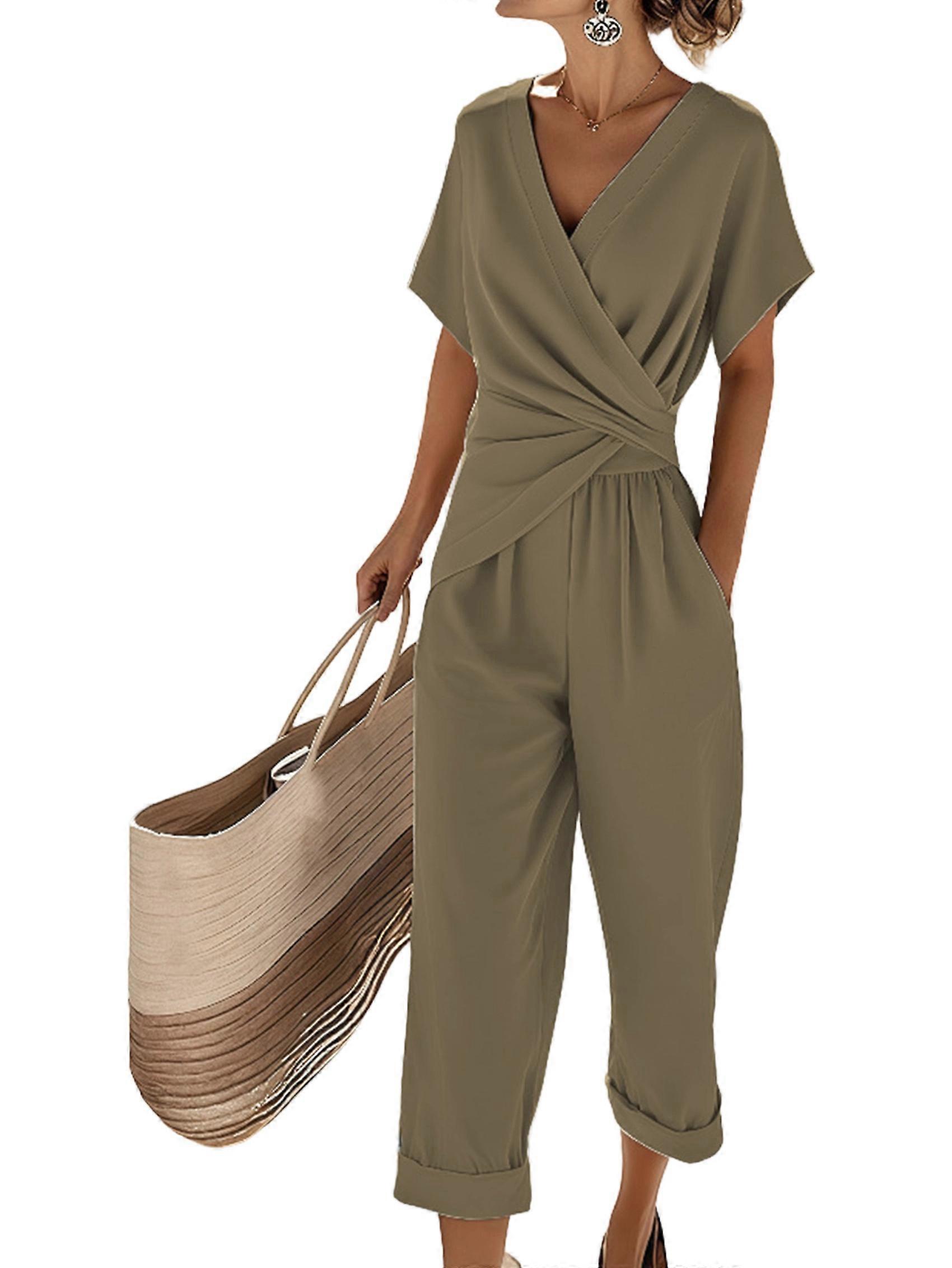 Women Short Sleeve Front Crisscross Tie Waist Belted Wide Leg Pant with Pockets Khaki XL