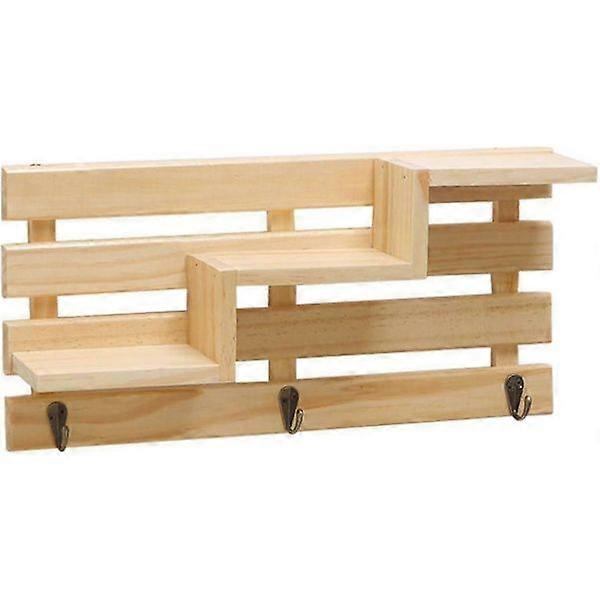 IDEAL HOME DECORATION: Practical wall-mounted mail and key chains can create additional storage space where you need it and utilize unused wall-mounted space; in entryways, hallways, utility rooms, kitchens, laundry rooms/storage rooms, garages, offices and other places where more storage space is needed. GENIOUS DESIGN: Creative solid wood wall shelf without perforation, sturdy and durable, looks good and has a longer service life. There are 3 hooks at the bottom, which are both beautiful and practical and can be used for wall decoration. The hook and wooden plank design are combined, and plants are added to the shelf to decorate your entrance to prevent it from slipping off. SAVE SPACE: The overall size is 15.5 inches (width) x 7.28 inches (height) x 3.2 inches (depth), compact structure, but spacious enough to accommodate your daily necessities. Create a welcoming space where everything is properly organized.