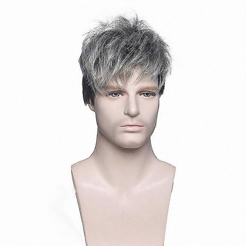 Men's Silver Gray Gradient Curly Short Wig Dark Gray Brown Hairpiece