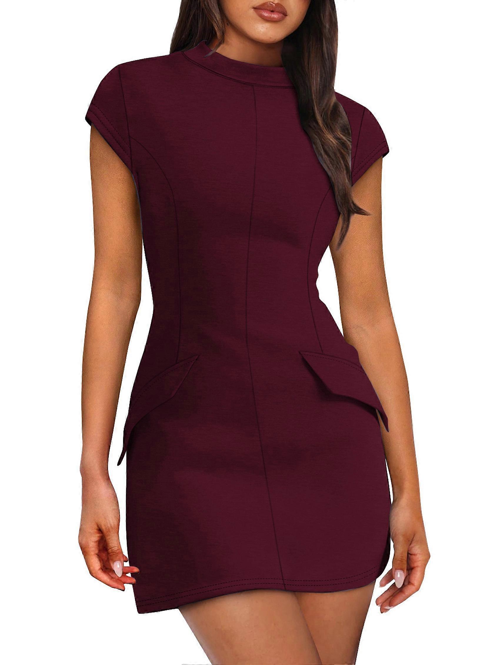 Womens Summer Dress Mock Neck Short Sleeve Bodycon Party Club Mini Dresses Wine Red S