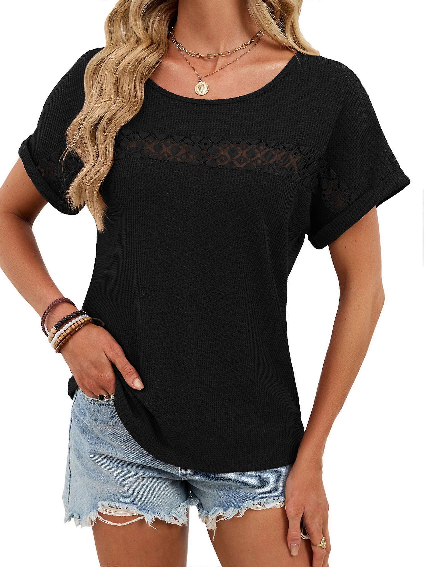 Our Womens Summer Tops are crafted from high-quality, lightweight materials that ensure breathability and comfort, making them a perfect addition to your summer wardrobe. Featuring a unique waffle knit round neck and short sleeves, this top elegantly blends romantic lace elements with a cozy feel, offering a stylish twist on classic casual wear. This essential T-shirt is a wardrobe staple that easily matches with a variety of bottoms. Whether you prefer denim for a laid-back look or need a refined layer for business occasions, this top enhances your elegance. Designed for both formal and casual settings, these fashionable tops are ideal for outings, work, leisure, travel, vacations, dates, parties, and shopping trips. Size: XXL=US12=UK16=EU44(cm / inch) Bust: 116.0 / 45.67, Sleeve: 28.0 / 11.02, Length: 67.0 / 26.38 Colour: Black Material: 65% Cotton, 35% Polyester, 5% Spandex Package Contents: 1*Casual Lace Blouse Only the above package content, other products are not included. Note: Light reflection and different displays may cause the color of the item in the picture a little different from the real thing. The measurement allowed error is +/- 1-3cm.