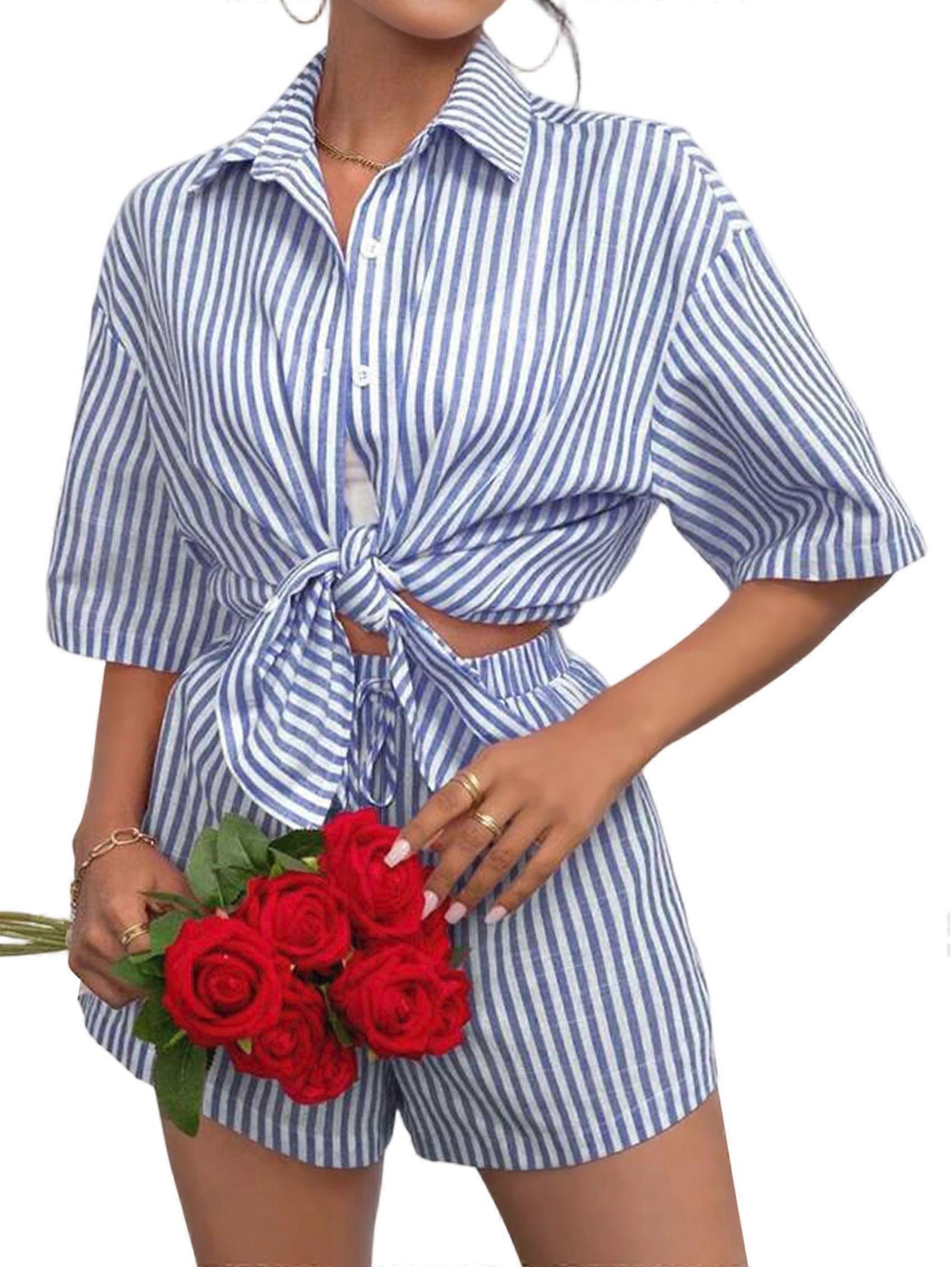Womens Collar Casual Striped Short Sleeve Pants Set Two Piece Lounge Wear Summer Outfit Blue Suit XS