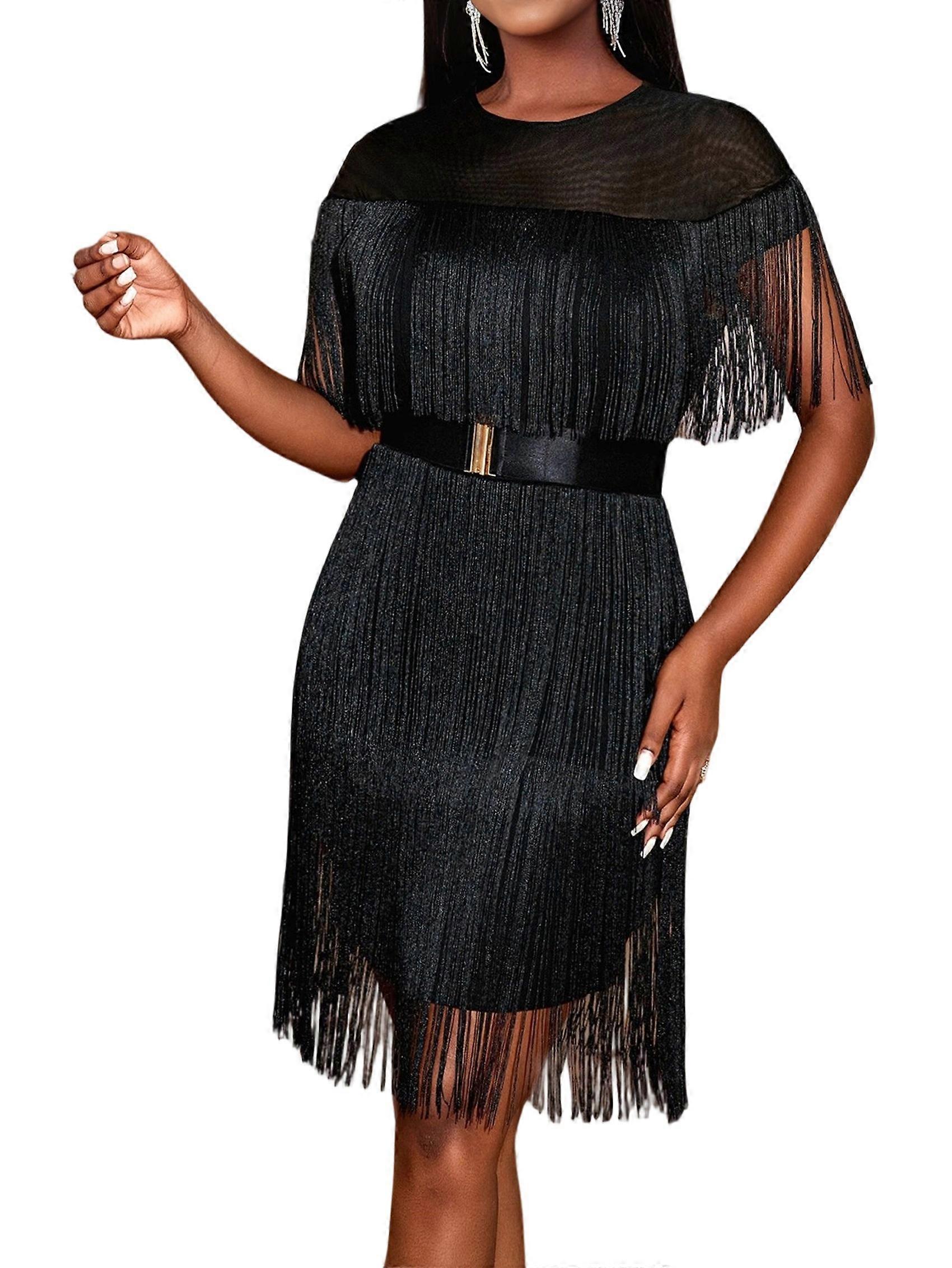Women'S Tassel Mini Dress for Evening Prom Party, Elegant Fringe Trim Cocktail Gown Black M