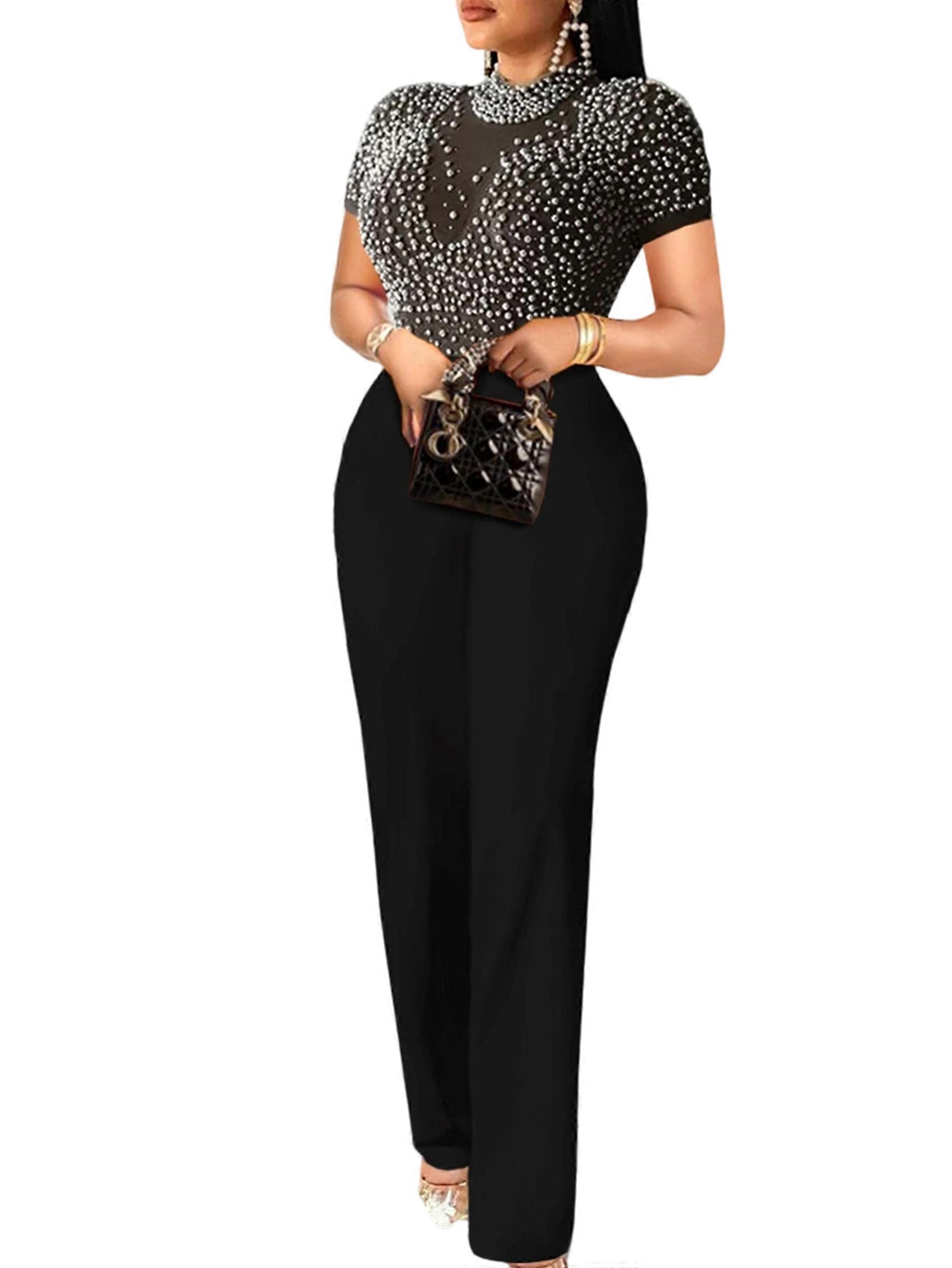 Crafted from a blend of 95% Polyester and 5% Spandex, this jumpsuit offers a soft, stretchy feel ensuring comfort all day or night. Its high-quality fabric provides an excellent fit and enhances durability for prolonged use. Featuring a see-through mesh bodice without a bra, adorned with sparkling silver glitter, this bodysuit combines elegance with a touch of allure. The mock neck and short sleeves add a sophisticated touch, perfect for showcasing your silhouette. Equipped with a snap button gusset on a thong bottom, this bodycon fit leotard is easy to pair with high-waisted pants, skirts, or shorts. Transform it from a casual daytime outfit to a glamorous evening look effortlessly. Ideal for a variety of settings such as casual outings, office environments, parties, clubwear, or even weddings. This versatile bodysuit is designed to cater to both daily wear and special events, ensuring you stand out in style. Size: M=US6=UK10=EU38(cm / inch) Bust: 90.0 / 35.43, Length: 144.0 / 56.69, Waist: 72.0 / 28.35, Hip: 98.0 / 38.58 Colour: Black Material: 95% Polyester, 5% Spandex Package Contents: 1 * Jumpsuit Only the above package content, other products are not included. Note: Light reflection and different displays may cause the color of the item in the picture a little different from the real thing. The measurement allowed error is +/- 1-3cm.