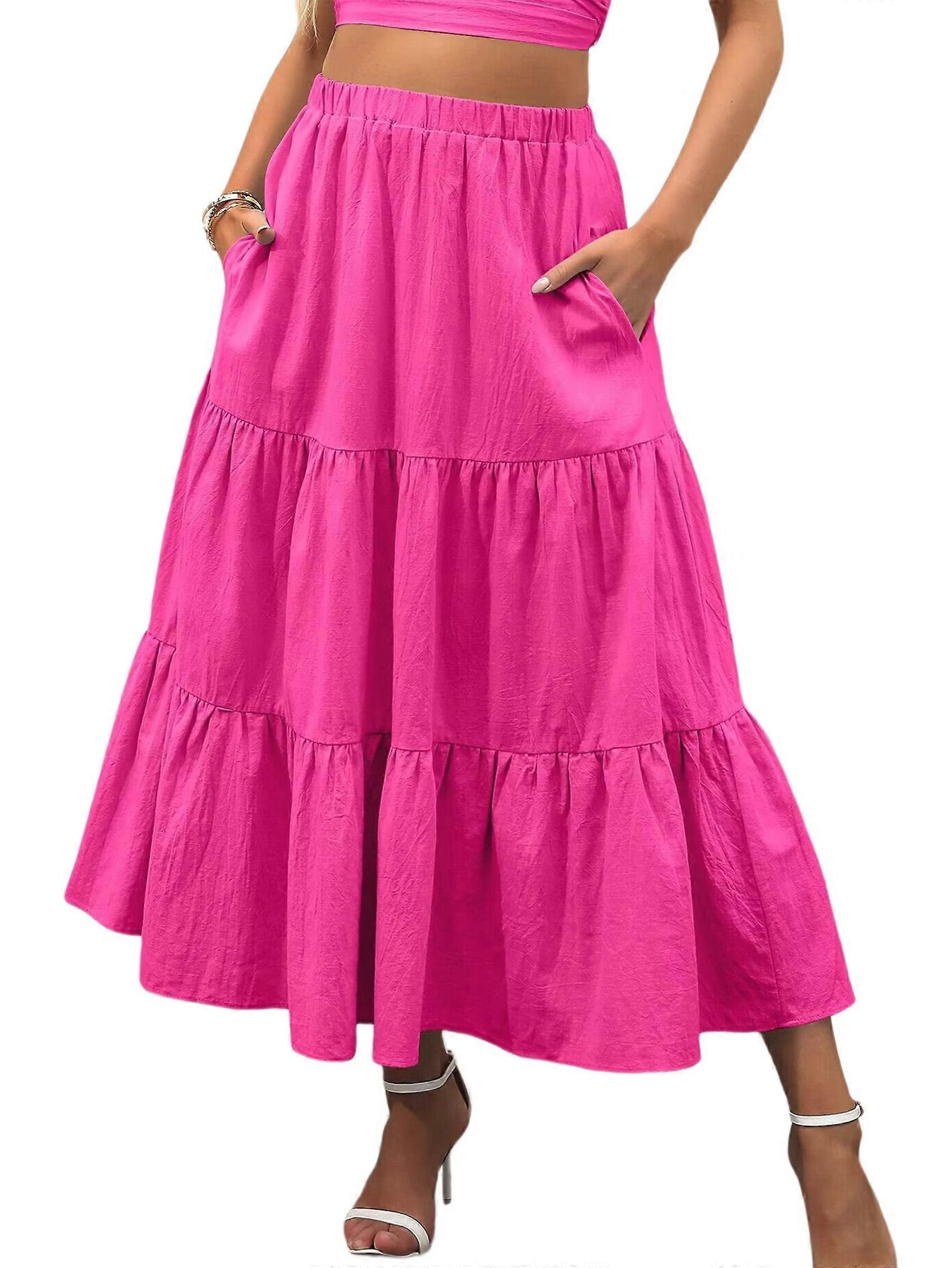 Women'S Casual Smock Layered Tiered Skirt High Waisted A Line Flowy Long Skirts with Pockets Rose Red L