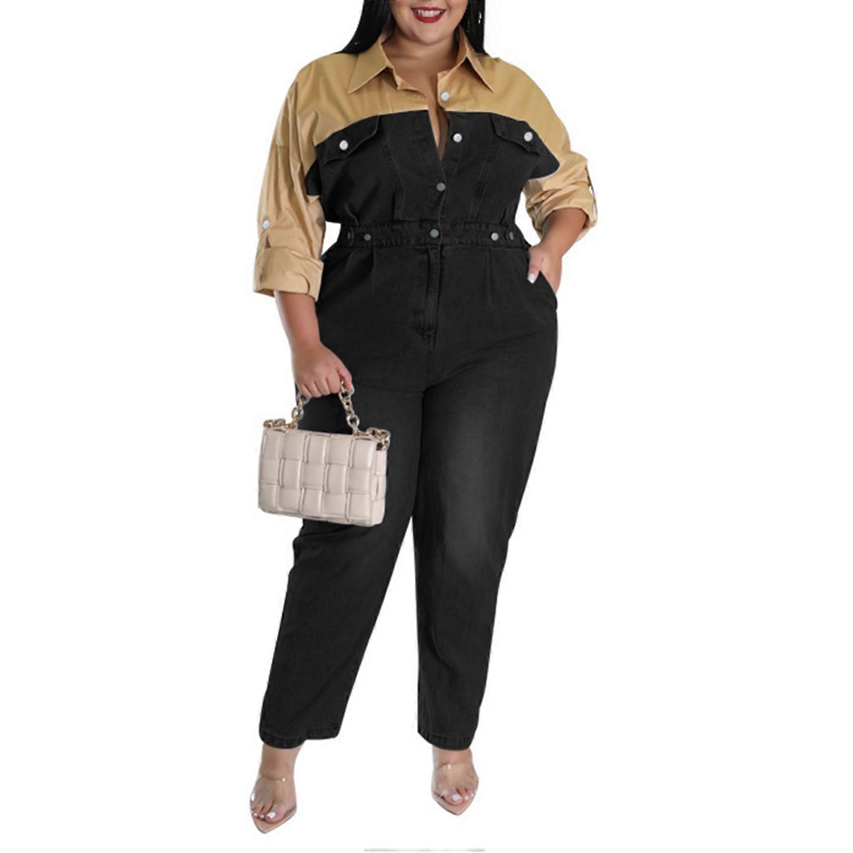 Crafted from premium cotton and polyester, this jumpsuit offers a stretchy, soft, and breathable fabric that ensures comfort throughout the day. Ideal for sensitive skin, we recommend hand washing to maintain its texture and quality. Elevate your wardrobe with this chic denim jumpsuit. Pair it with a stylish belt and your choice of sneakers or heels for a complete, fashion-forward look. Whether you're stepping out for a casual day or dressing up for a night out, this jumpsuit adapts to your style needs. Featuring a button closure, a flattering V-neck, and a lapel collar, this jumpsuit combines fashion with comfort. Its long sleeves, elastic high waist, and loose fit enhance your silhouette while keeping the classic and timeless appeal of denim. This versatile jumpsuit is perfect for a range of activities, from casual outings, work engagements, and shopping trips to travel, beach visits, and parties. Its durable design ensures it can keep up with your busy lifestyle. Size: 4XL=US16=EU48=UK20(cm / inch) Bust: 134.0 / 52.76, Sleeve: 67.0 / 26.38, Waist: 110.0 / 43.31 Colour: Black Material: 65% Cotton, 35% Polyester Package Contents: 1 *Jumpsuit Only the above package content, other products are not included. Note: Light reflection and different displays may cause the color of the item in the picture a little different from the real thing. The measurement allowed error is +/- 1-3cm.