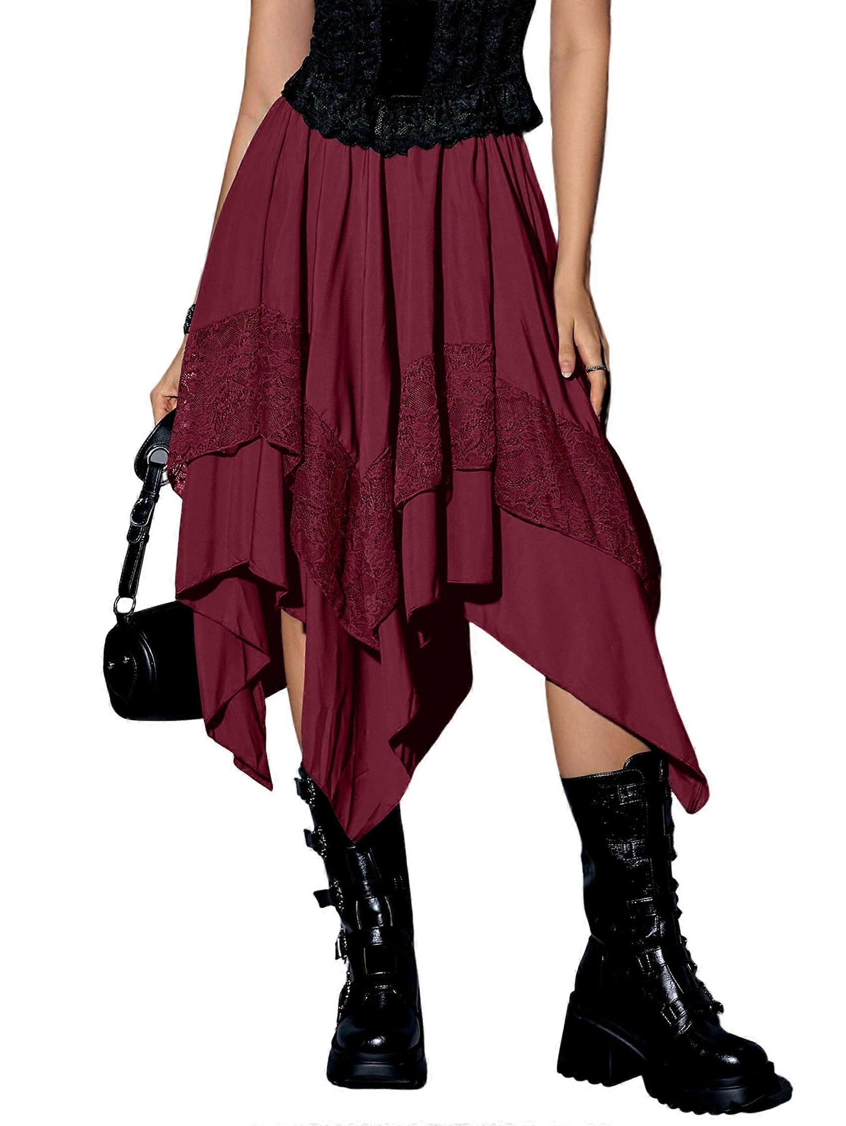 Women'S Renaissance Flowy Fairy Skirt Y2k Contrast Lace Layered Asymmetrical Midi Skirts Deep Red M