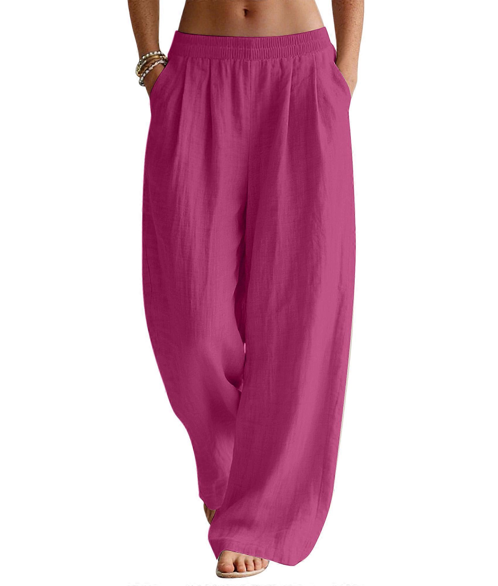 Women Wide Leg Palazzo Summer Flowy Pants Beach Vacation Clothes Elastic Waist Travel Trousers with Pockets Rose Red XL