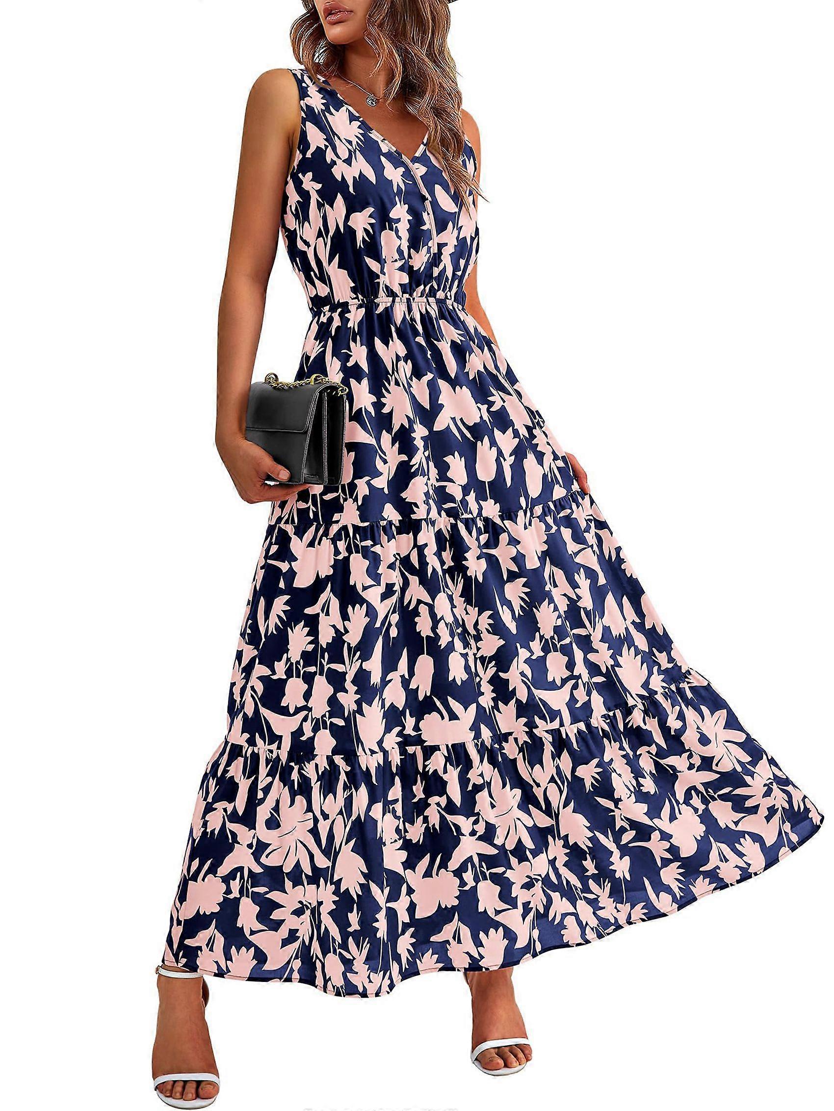 Women'S Summer Dresses Casual Sleeveless Maxi Dresses Cute Floral Long Dress Wedding Guest Dress Navy Blue XXL