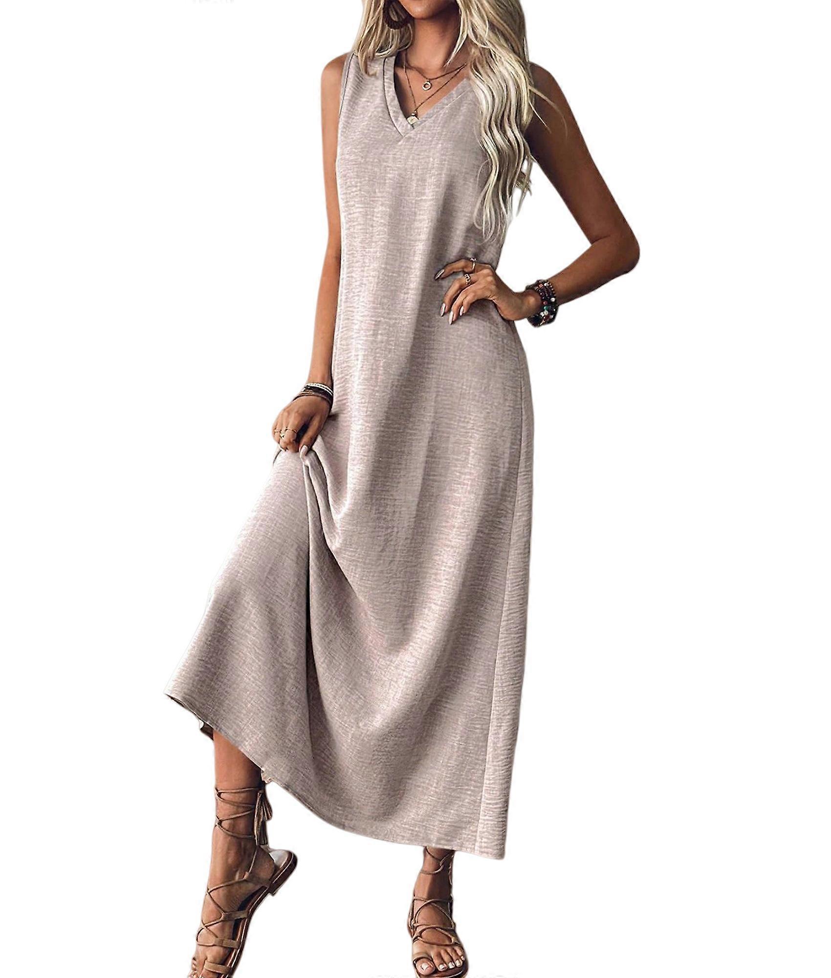 Summer Dresses for Women Cotton Linen Maxi Dress Casual Sleeveless Solid Long Sundress Khaki XXL