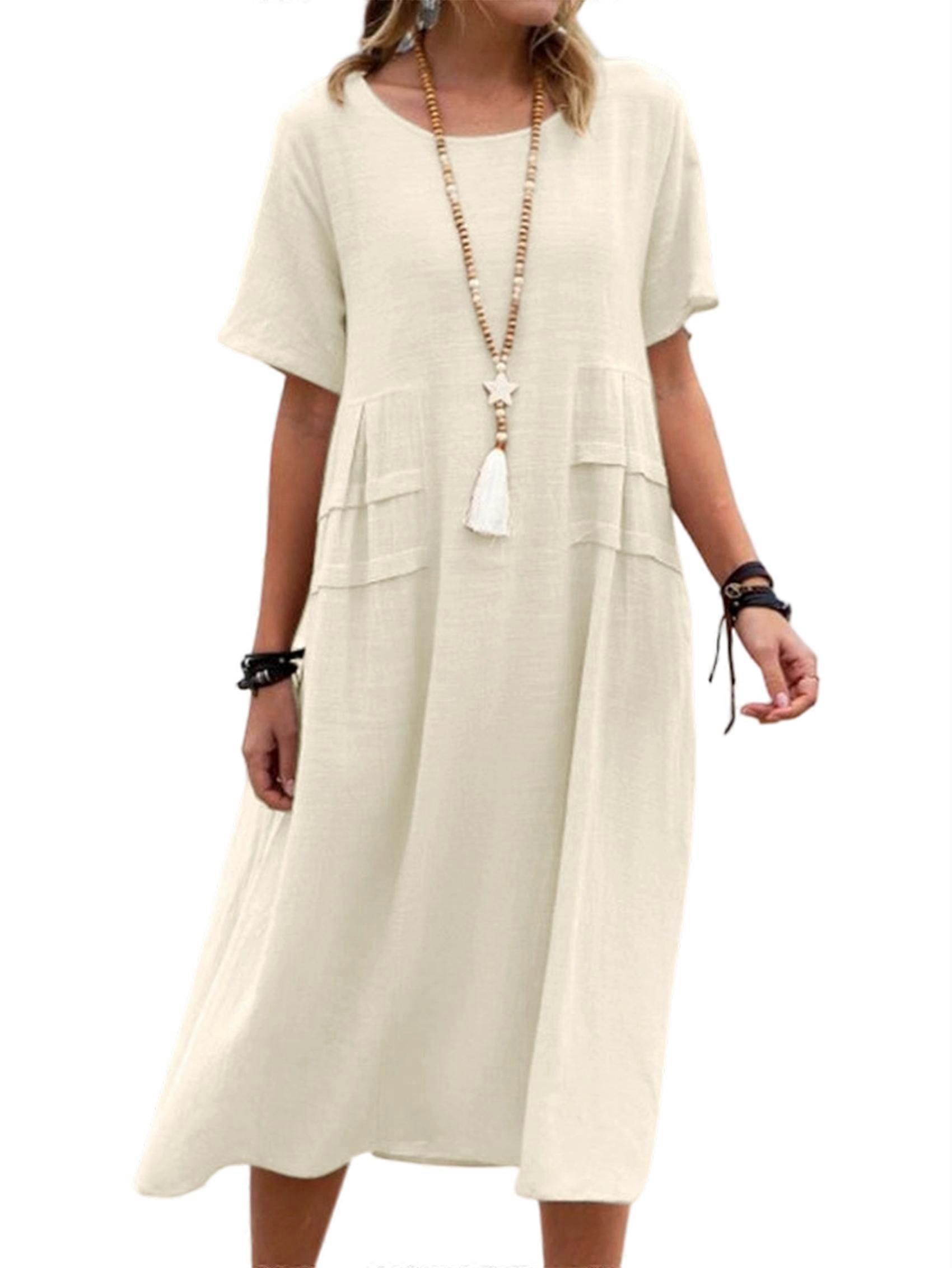 Womens Loose Fit Casual Linen Blend Solid Color Round Neck Short Sleeve Midi Dress Beach Khaki M