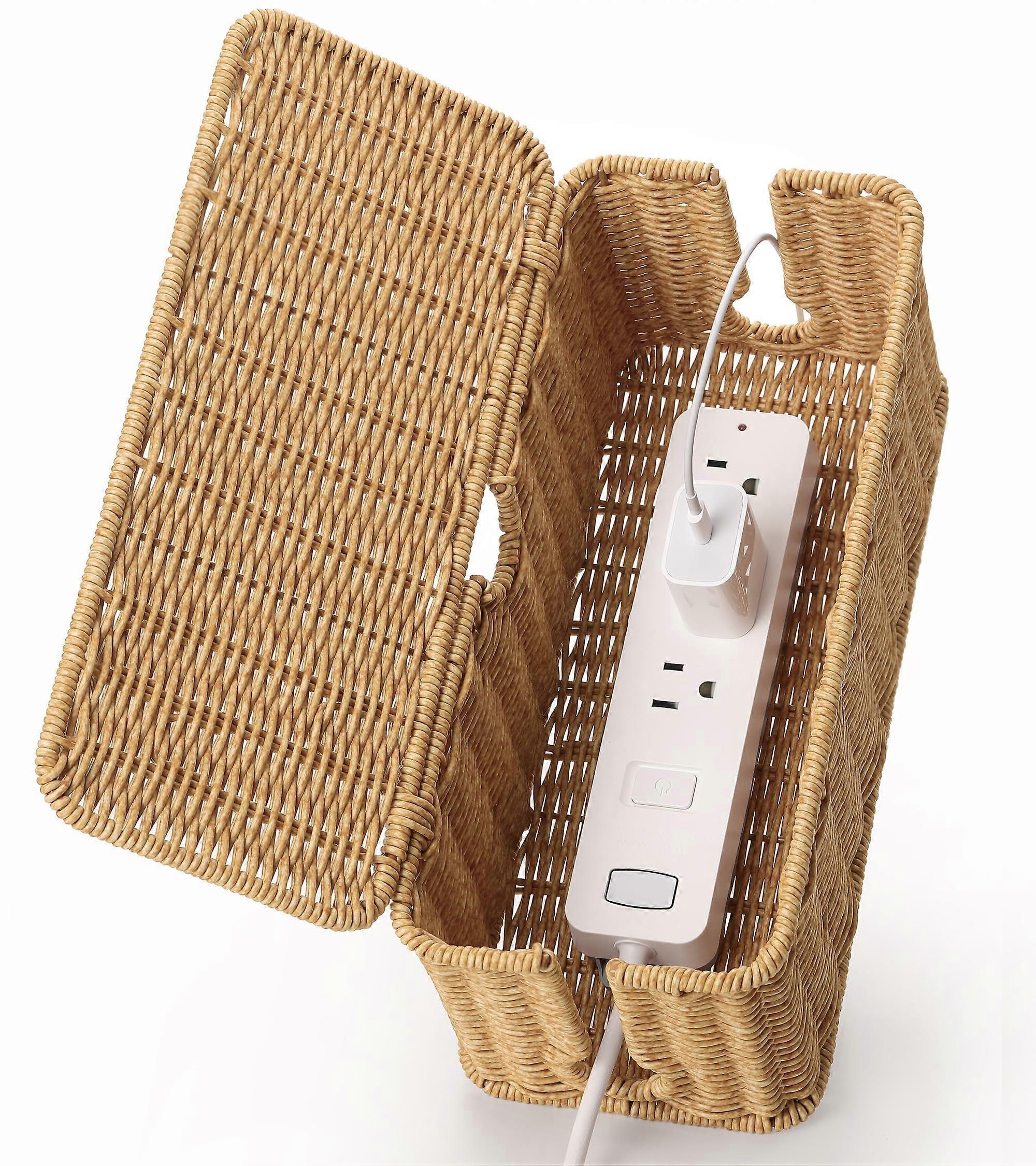 Handmade Rattan Style Cable Management Box Brown for Desk with Large Capacity Hidden Power Strip Design