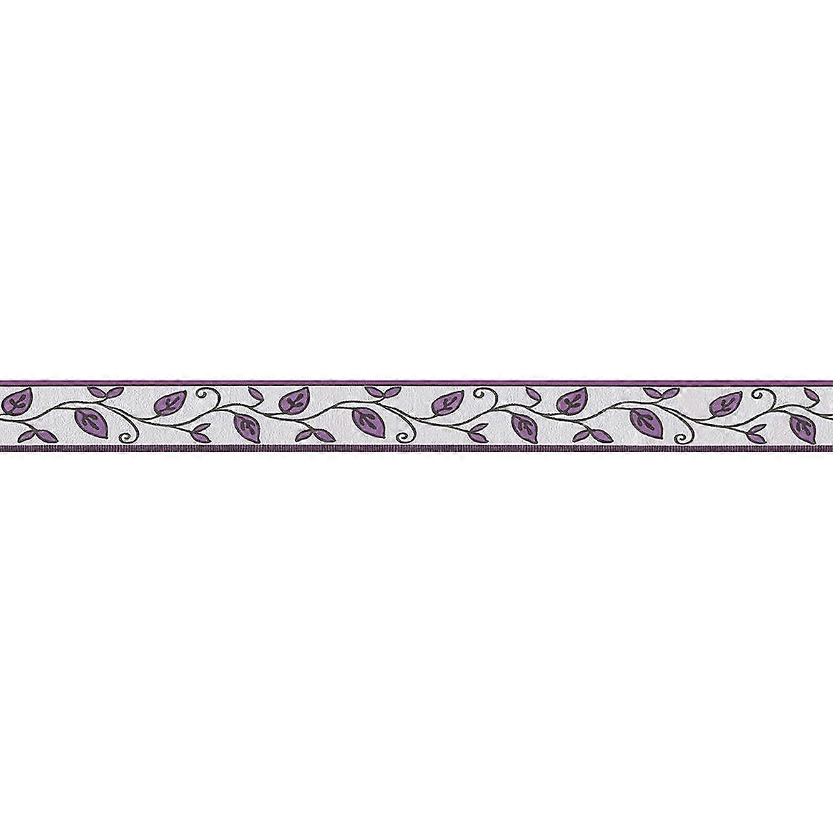 Bring a refined decorative finish to your interior with this elegant self-adhesive wallpaper border, designed to add subtle colour and pattern without overwhelming your space. Featuring a delicate trailing vine design with stylised leaves in soft and deep purple tones set against a lightly textured pale background, this border creates a balanced look that works beautifully in both modern and traditional rooms. The slim double-line edging in coordinating purple frames the design neatly, helping to define walls and create a clean, professional finish around the top of a room, along dado rails, or as a feature divider between painted and wallpapered surfaces.