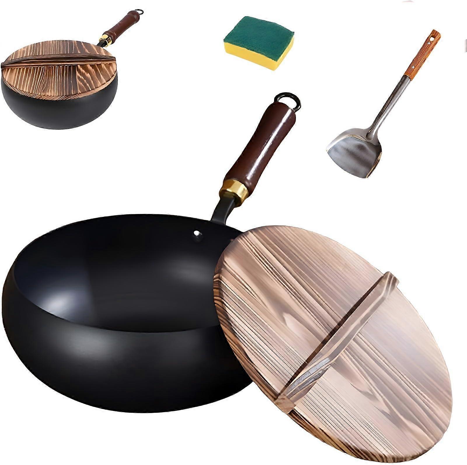 Japanese Iron Pan 30cm Hand Forged Wok with Wooden Lid, Fast Even Heat, Nonstick No Coating