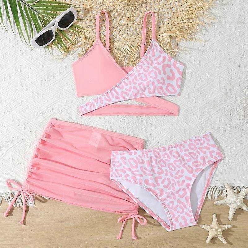 Girls 3pack Pink Leopard Cross Wrap High Waist Bikini Beach Skirt Kids Swimsuit 7-12 Years Children's Swimwear Bathing Suit Girl