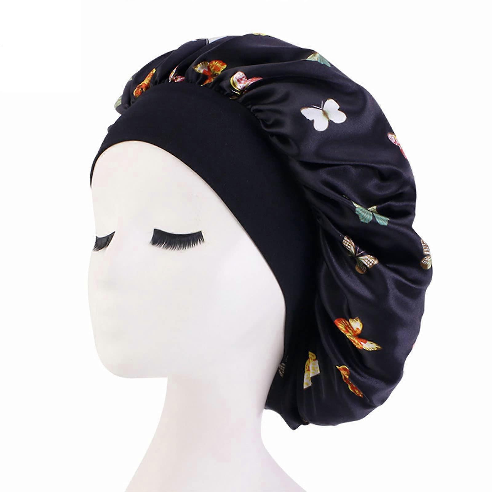 Silk Sleep Cap Butterfly Print Hair Turban for Sleeping and Frizz Control Black Medium