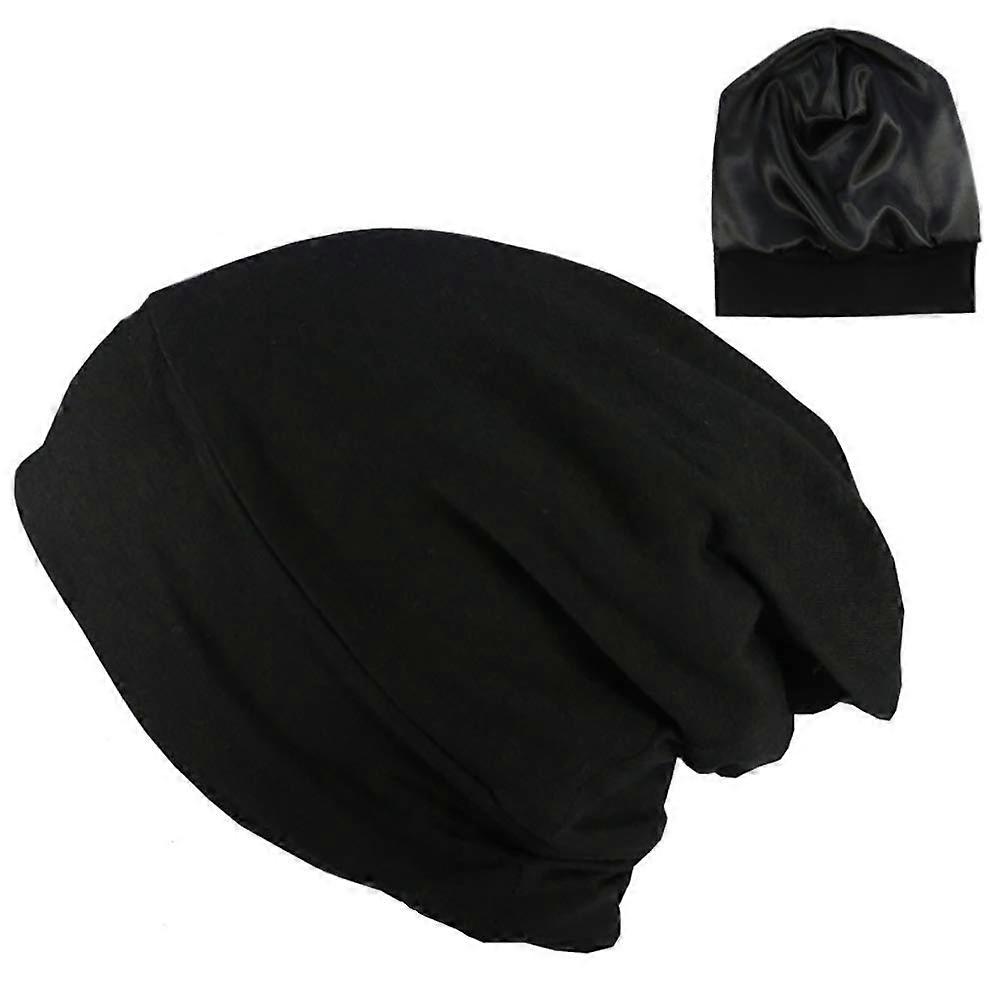 Satin Lined Bonnet for Curly Hair Sleep Cap with Wide Band, Unisex Slouchy Hat Black