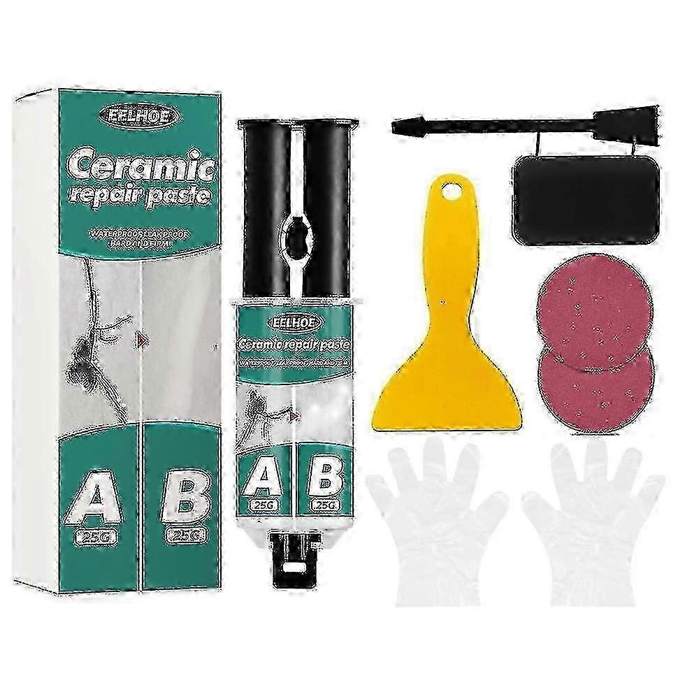Application - Use to repair chips, scratches, dents, cracks, worns and holes for any porcelain ceramic surface like tub, tile, shower, bathtub, vanities, sink. Also work on fiberglass, stone, plastic. High performance - All of our mixture are permanent repairs and are stronger than the original object. With strong adhesion and good stckness, can be used as an adhesive for joint of component. Easy to use - Repairs in a few simple steps- All you need is mix repair compound part A and part B together, apply them to demaged area, then smooth the surface. Quick dry - It only takes about 10 minutes to get a dry surface after applied Effective - Once dried, the surface is glossy and have porcelain-like appearance. Specifications: Name: Tile Repair Paste Glue: 16.4x4.5cm Stirring Stick Lid: 9.5x5cm Scraper: 5x12cm Sandpaper: 5cm Weight:25g 25g Package Included: 1x Tile Repair Paste(AandB) 1x Scraper 1x Black stirring Stick 2x Sandpaper 1x Disposable gloves